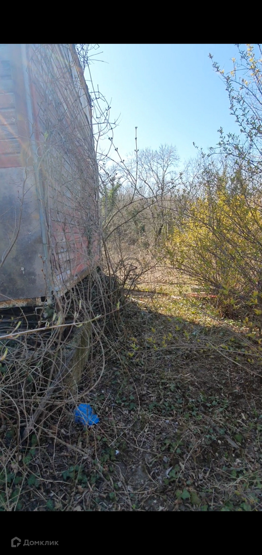 На участке стоит старый вагончик.