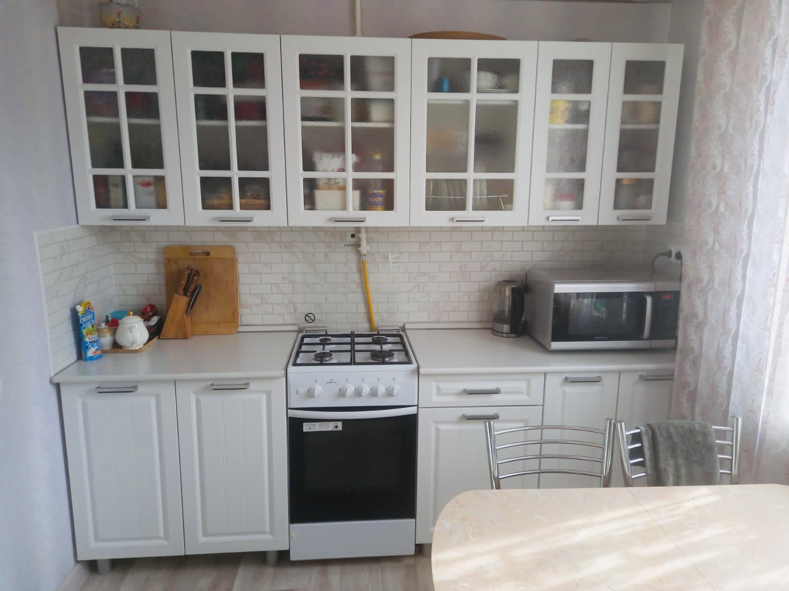 В доме остаётся вся мебель. Есть сплит система, холодильник. Кухня, плита, газовый котел, газовая колонка - все почти новое. Можно заезжать и жить.