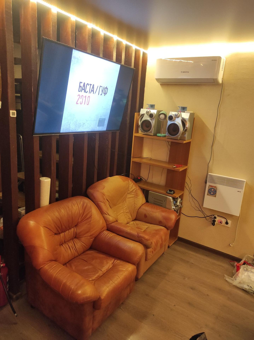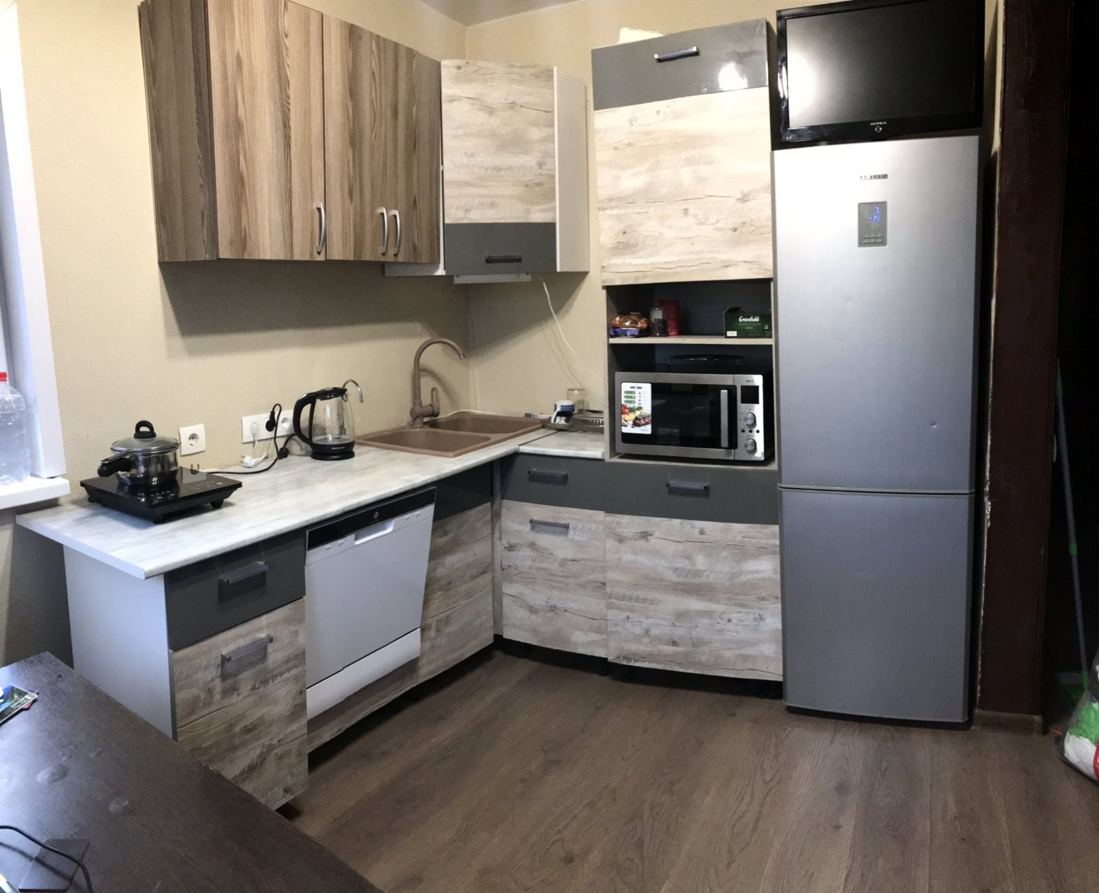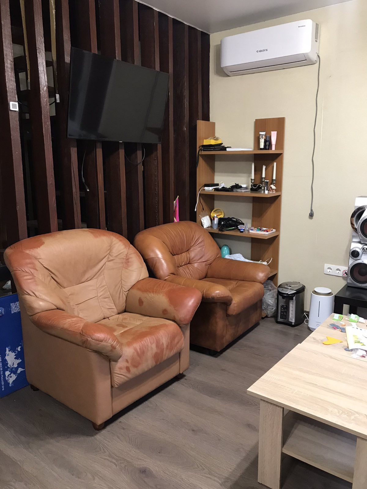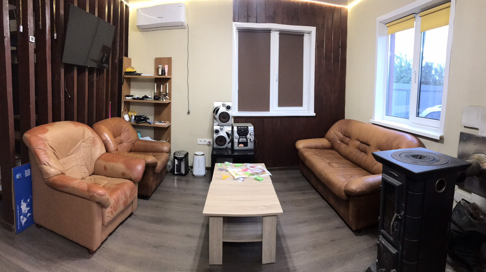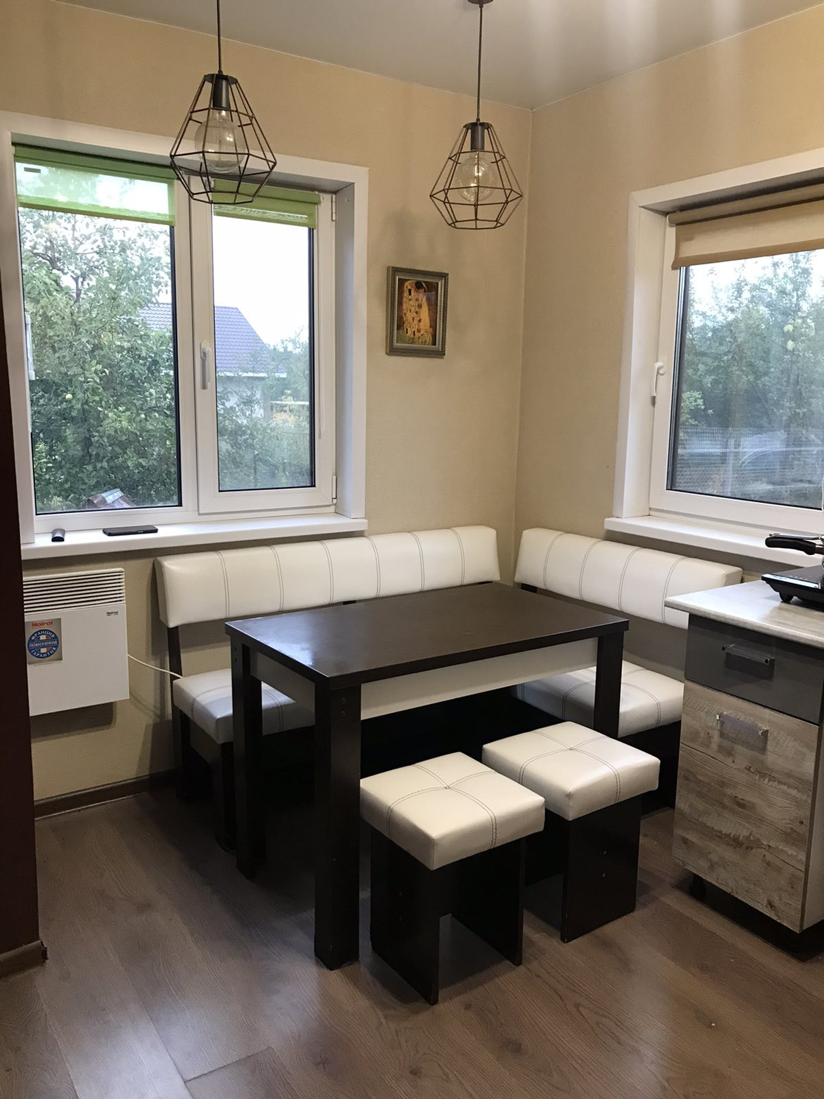 Мебель и техника: две двуспальные кровати 160*200, кожаный диван(раскладывается), два кресла, обеденная зона, кондиционер, стиральная машинка, водонагреватель, посудомоечная машина, холодильник, микроволновка(духовка), конвекторы, индукционные плитки.