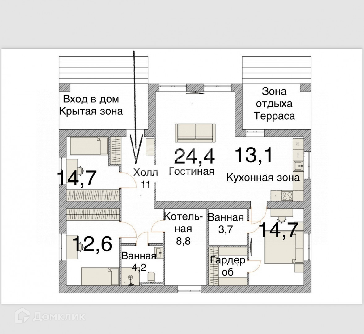 Дом площадью 114 кв.м., одноэтажный, имеется мансарда-чердак, предчистовая отделка, подключённые коммуникации.