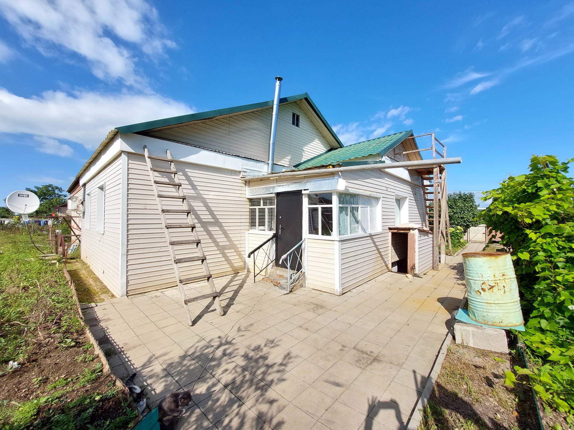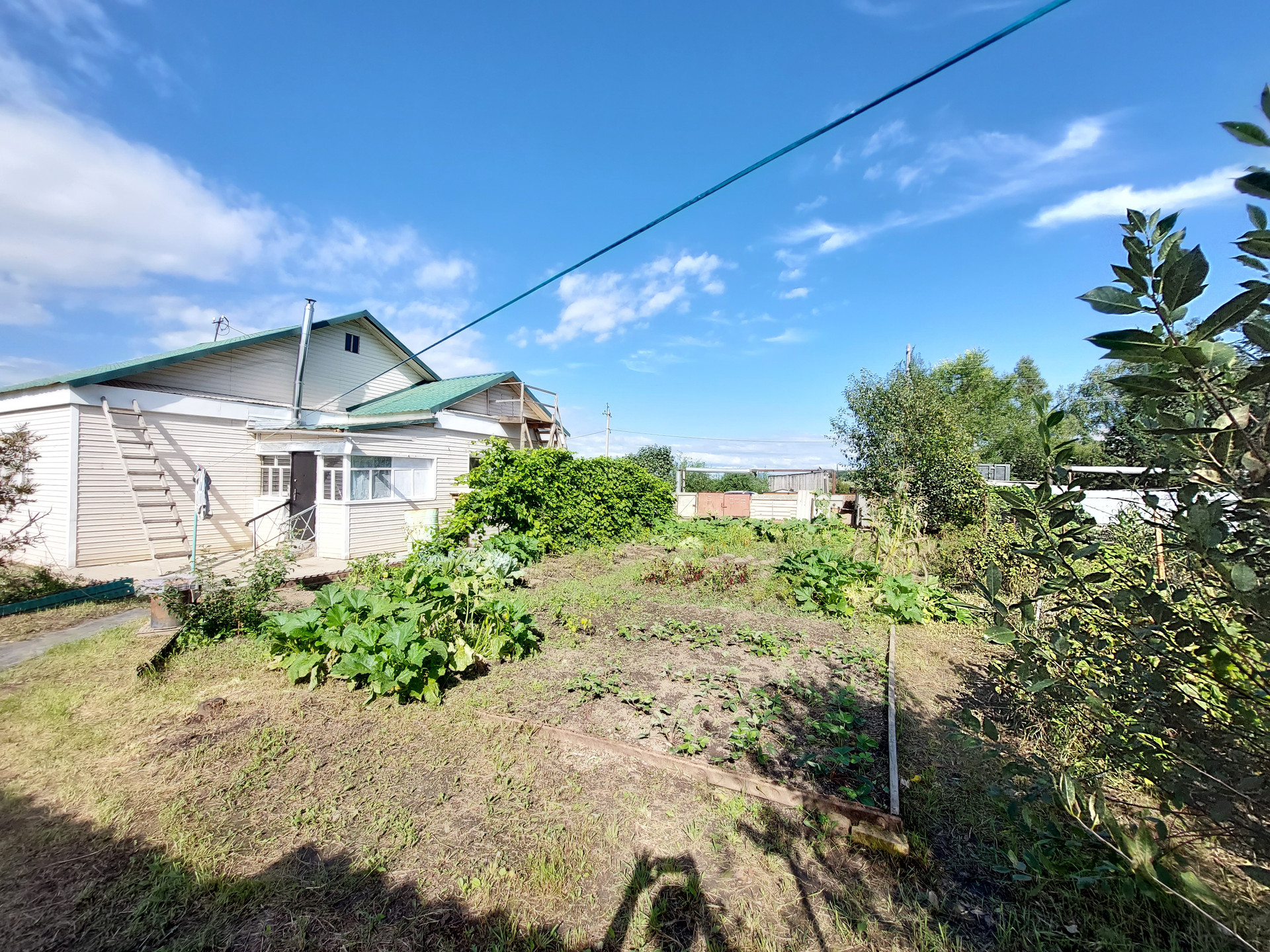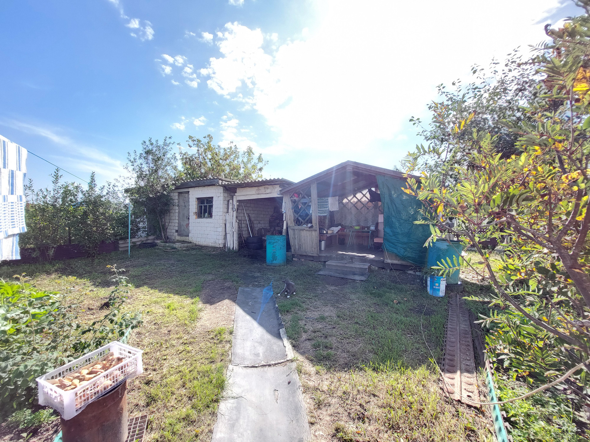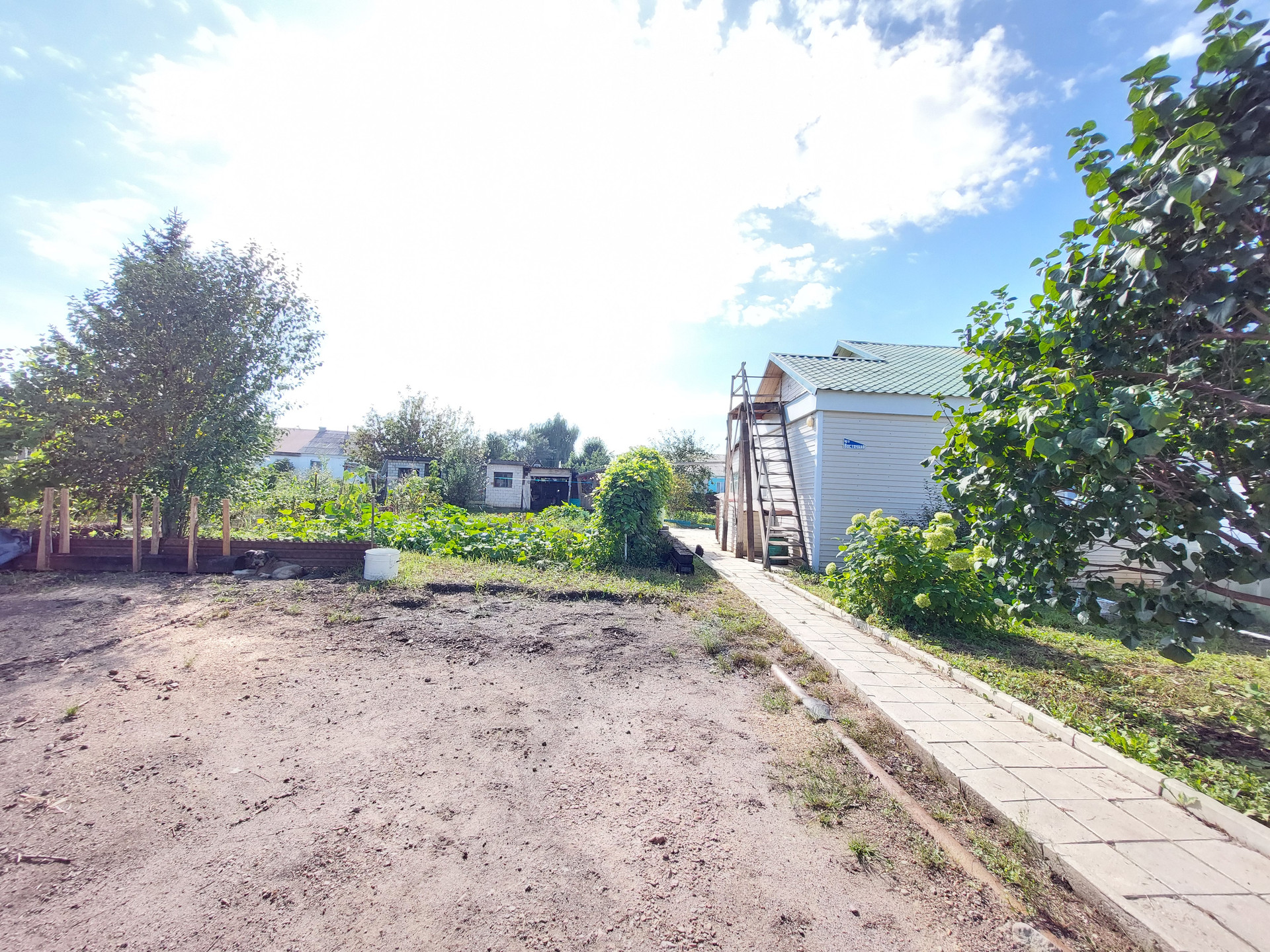 Во дворе дорожки вымощены брусчаткой, много плодово-ягодных насаждений.