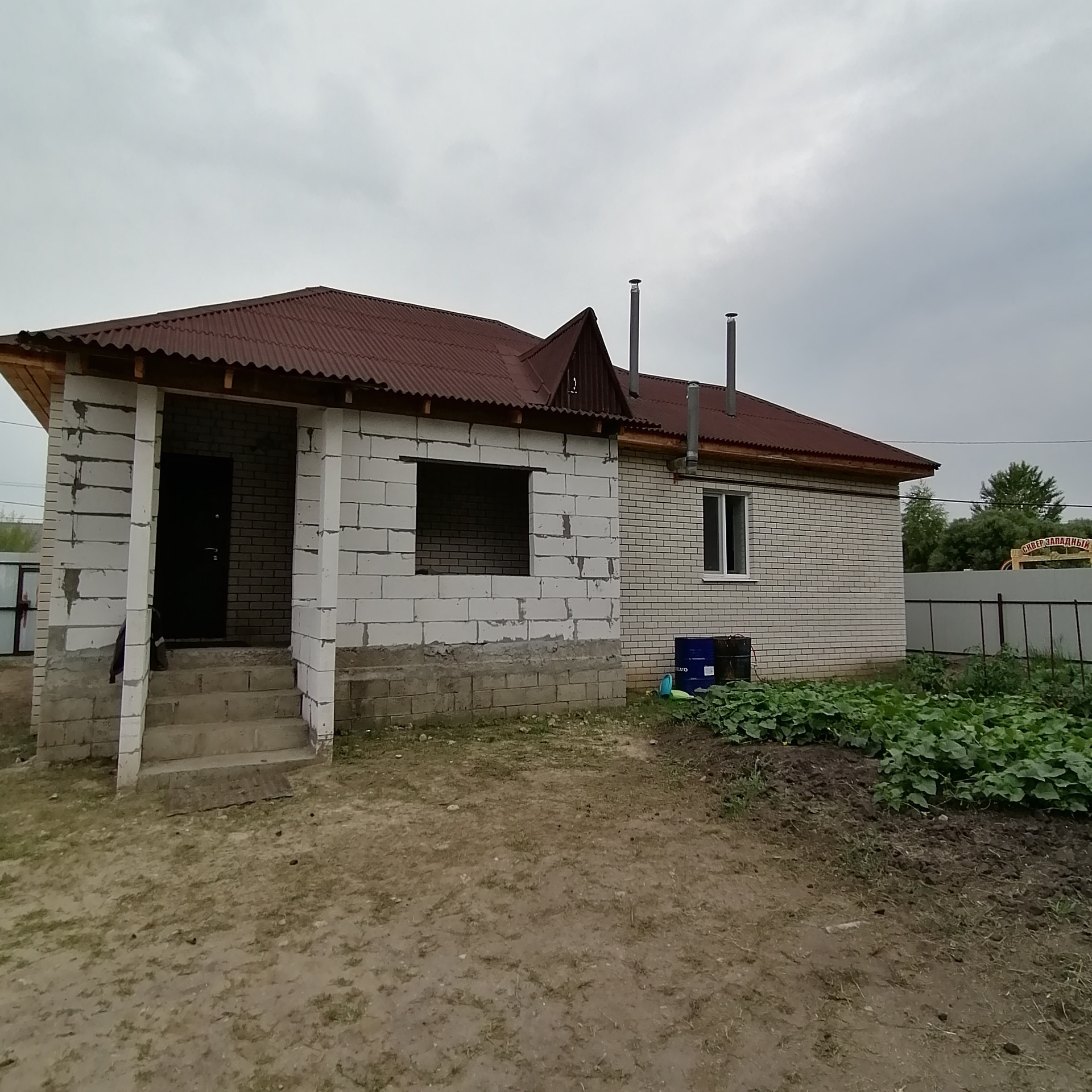 Внутренние стены шлакоблок (зимой очень тепло, летом держит прохладу), снаружи силикатный кирпич, нижнее перекрытие плиты, потолок дерево, крыша покрыта ондулином.  Стеклопакеты во всех комнатах, теплые полы (кухня, коридор, ванная комната, туалет) полы плитка, ламинат, стены готовы под обои или покраску. Все коммуникации подведены. Дом находится в очень живописном месте (сквер Западный, красивая аллея).  Гараж на две машины, летняя беседка, фундамент под баню, огород, территория огорожена.