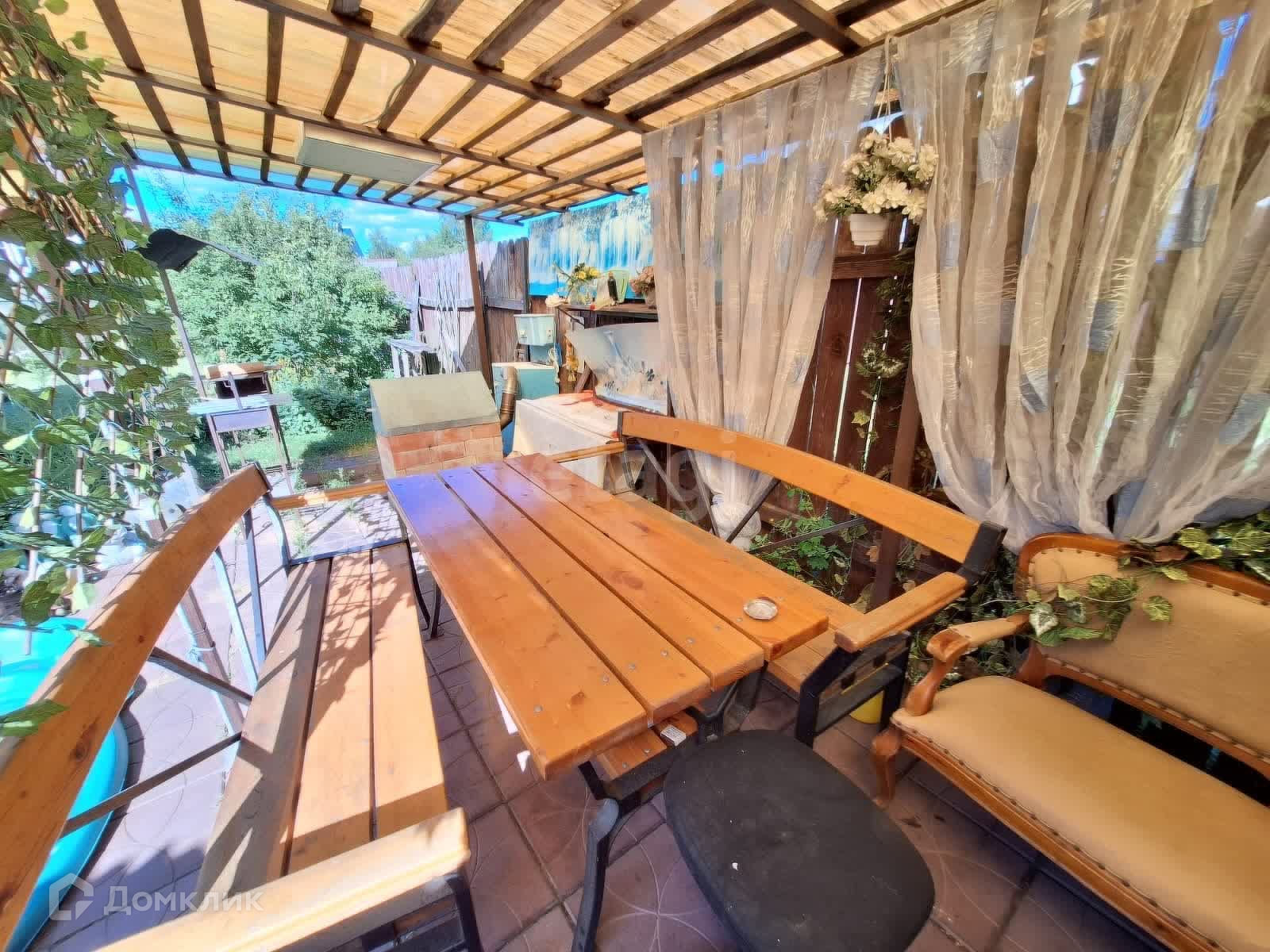 Вся территория облагорожена: регулярно стригут газон, посажены много культурных деревьев, кустарников и цветов. На участке также установлена большая теплица, просторная баня, большая крытая мангальная зона,