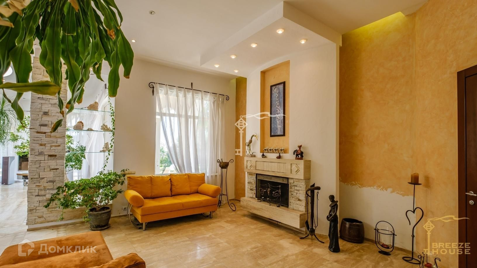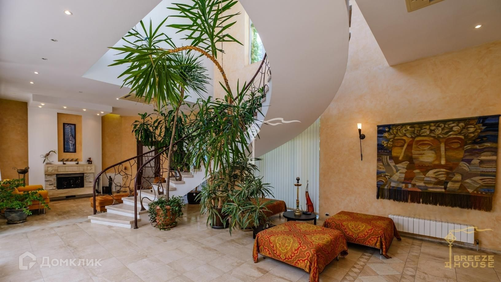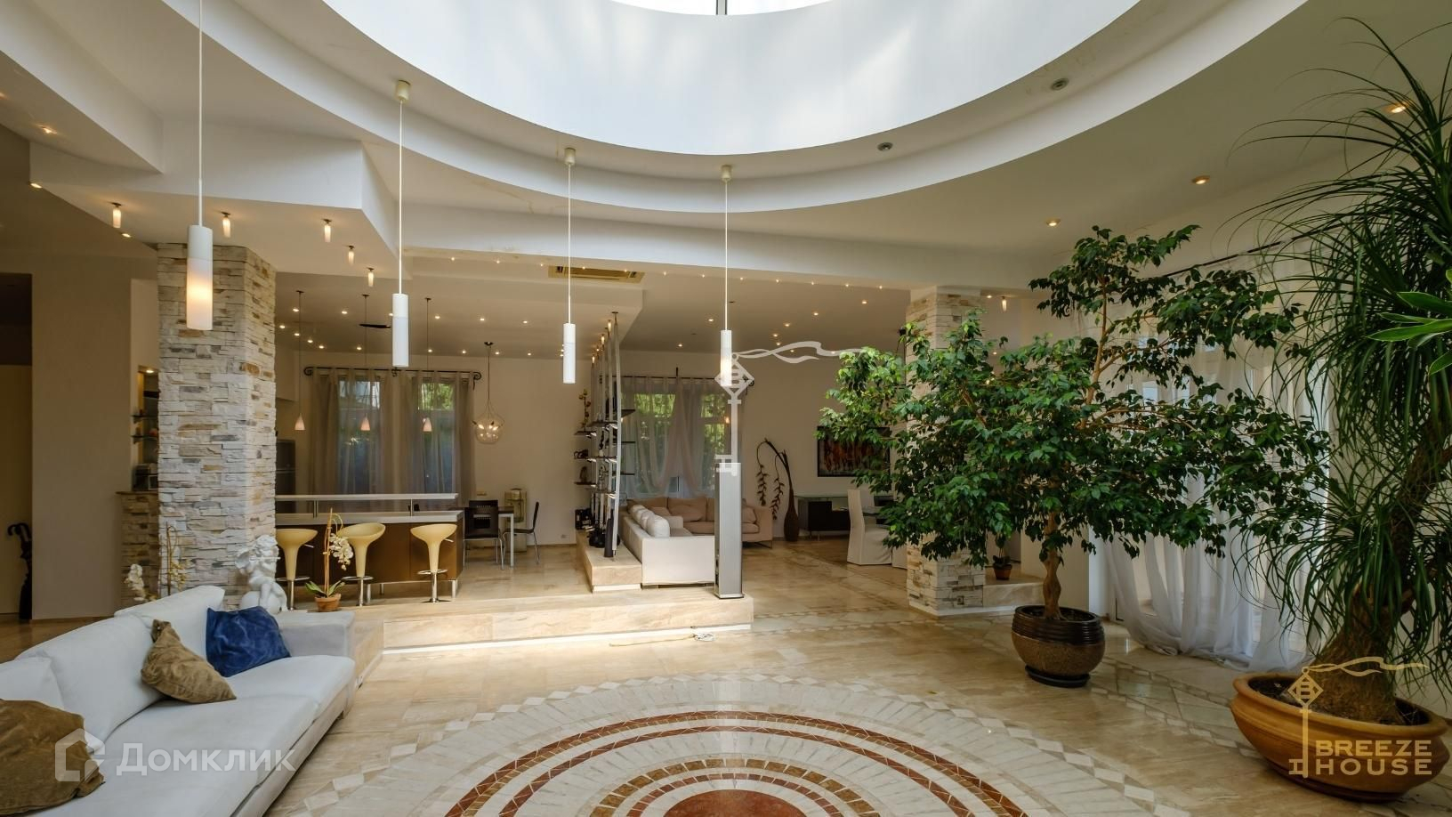 -большой холл-гостиная под стеклянный куполом с каминной зоной и выходом во двор к бассейну,