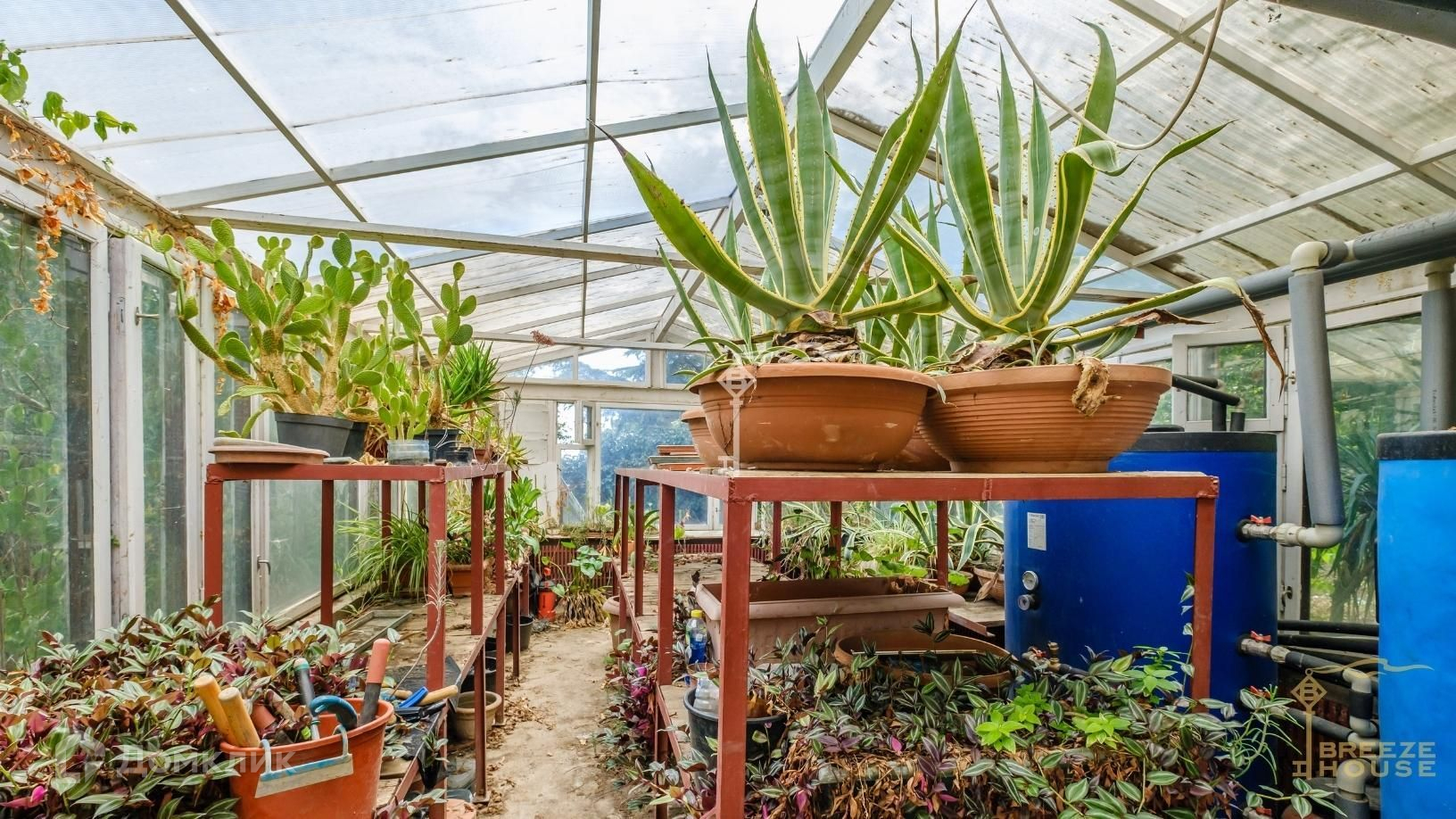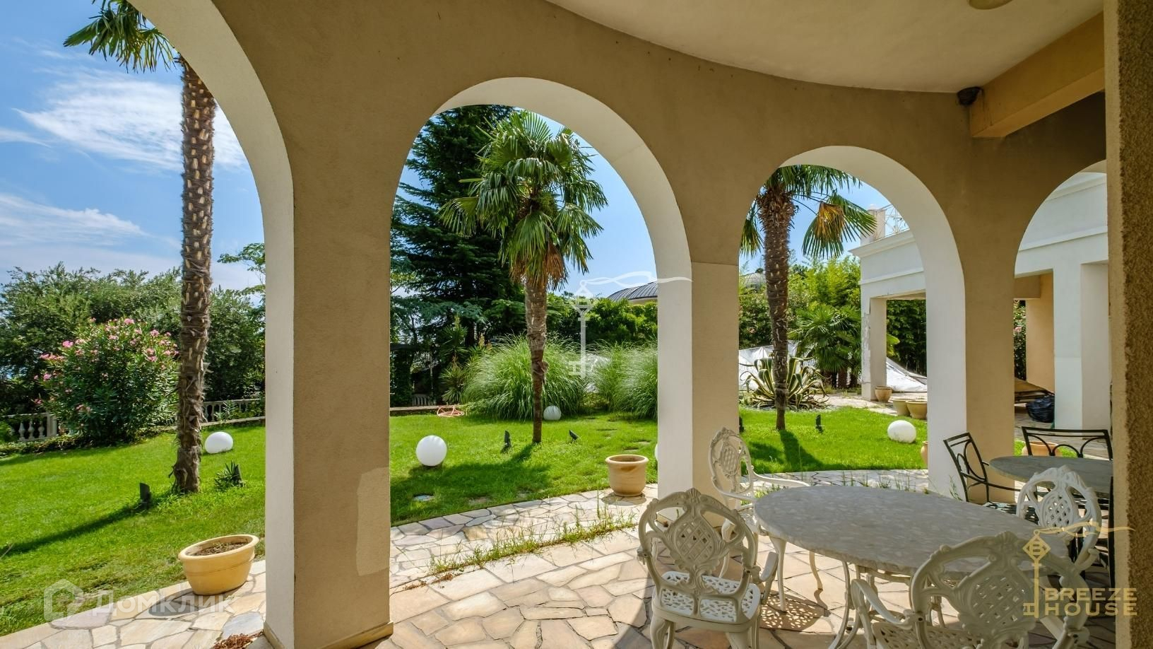 На огороженной территории выполнено ландшафтное озеленение и освещение. Высажены экзотические растения: пальмы, кедр, олива, большая агава, кипарисы, можжевельник и другие.