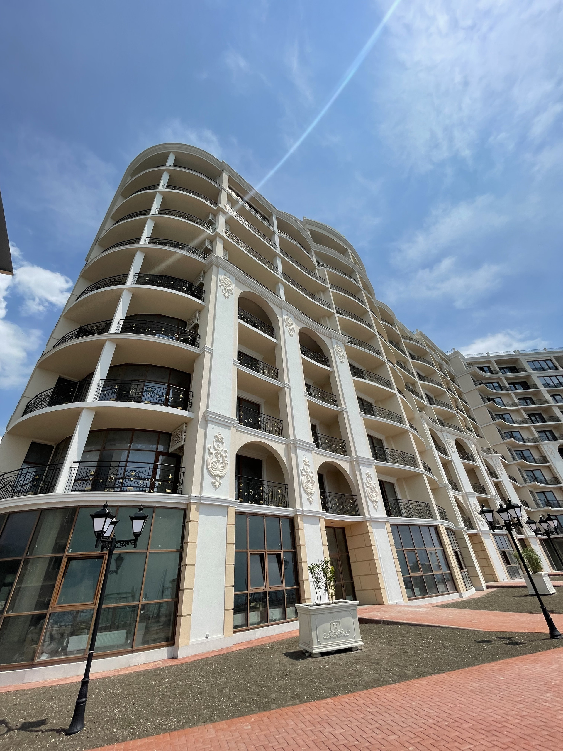 Территория комплекса благоустроена и охраняется, организованы детские и спортивные площадки, планируется спа-центр с бассейном и ресторан с баром на набережной. Кроме того, пляж будет также благоустроен, включая шезлонги, зонтики и станцию спасателей.