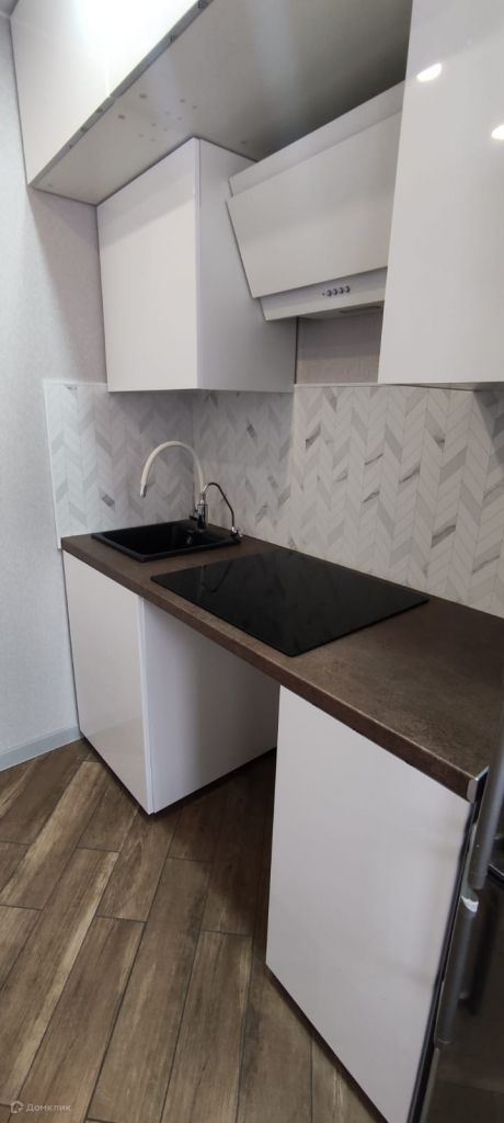 На кухне встроенная мебель, индукционная панель, вытяжка, холодильник.
