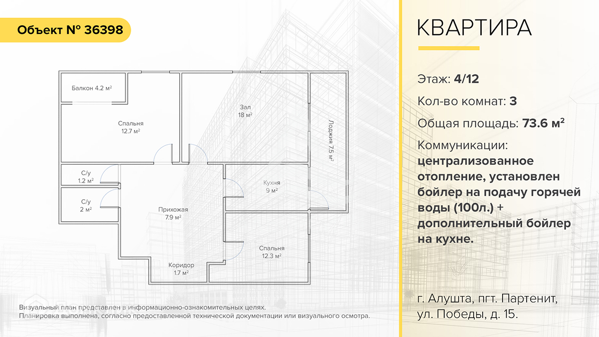 Вашему вниманию 3-комнатная квартира в городе Алушта, поселок городского типа Партенит, улица Победы, дом 15. Расположена на 4 этаже 12-этажного дома. Общая площадь 73.6 м² (без учета лоджии и балкона 63.7 м²), из которых жилая 43 м².