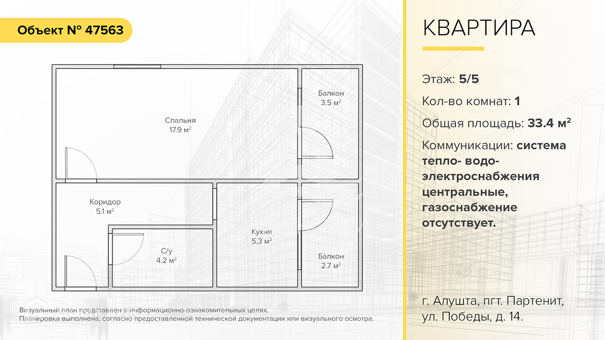 1-комнатная квартира, 33.4 м2, этаж 5 / 5, на продажу в посёлке городского типа Партенит, улица Победы, 14