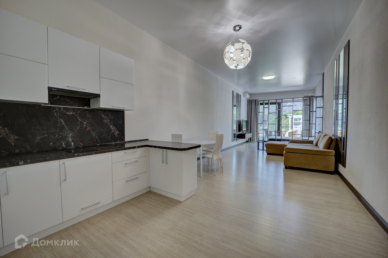 Апартаменты общей площадью 64,2 м² расположены на 5 этаже. В апартаментах выполнен дизайнерский ремонт, установлена вся необходимая мебель и бытовая техника для комфортного проживания.