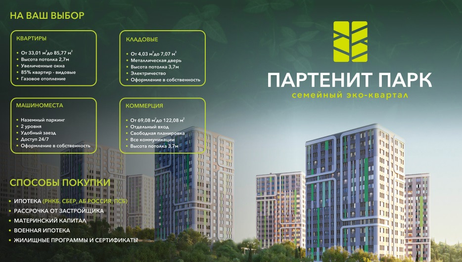 Эко-квартал "Партенит Парк" - это масштабный жилой проект в Партенитской долине. Его территорию со всех сторон окружают неповторимые пейзажи - лес, горы и море. Из окон открывается вид на загадочную гору Аю-Даг. На территории квартала будет собственный торговый центр, паркинги, торгово-сервисная инфраструктура на первых этажах домов. Во дворах - современные детские и спортивные площадки.