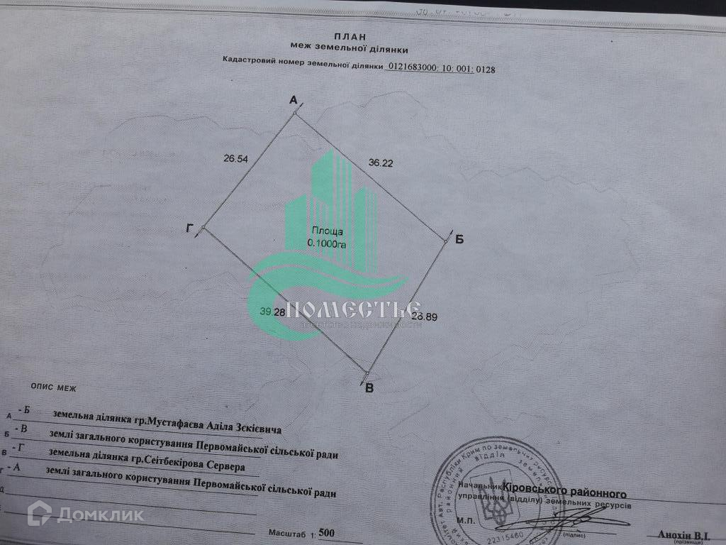 Продам земельный участок размером 10 соток в пгт. Первомайское Кировского района Республики Крым.