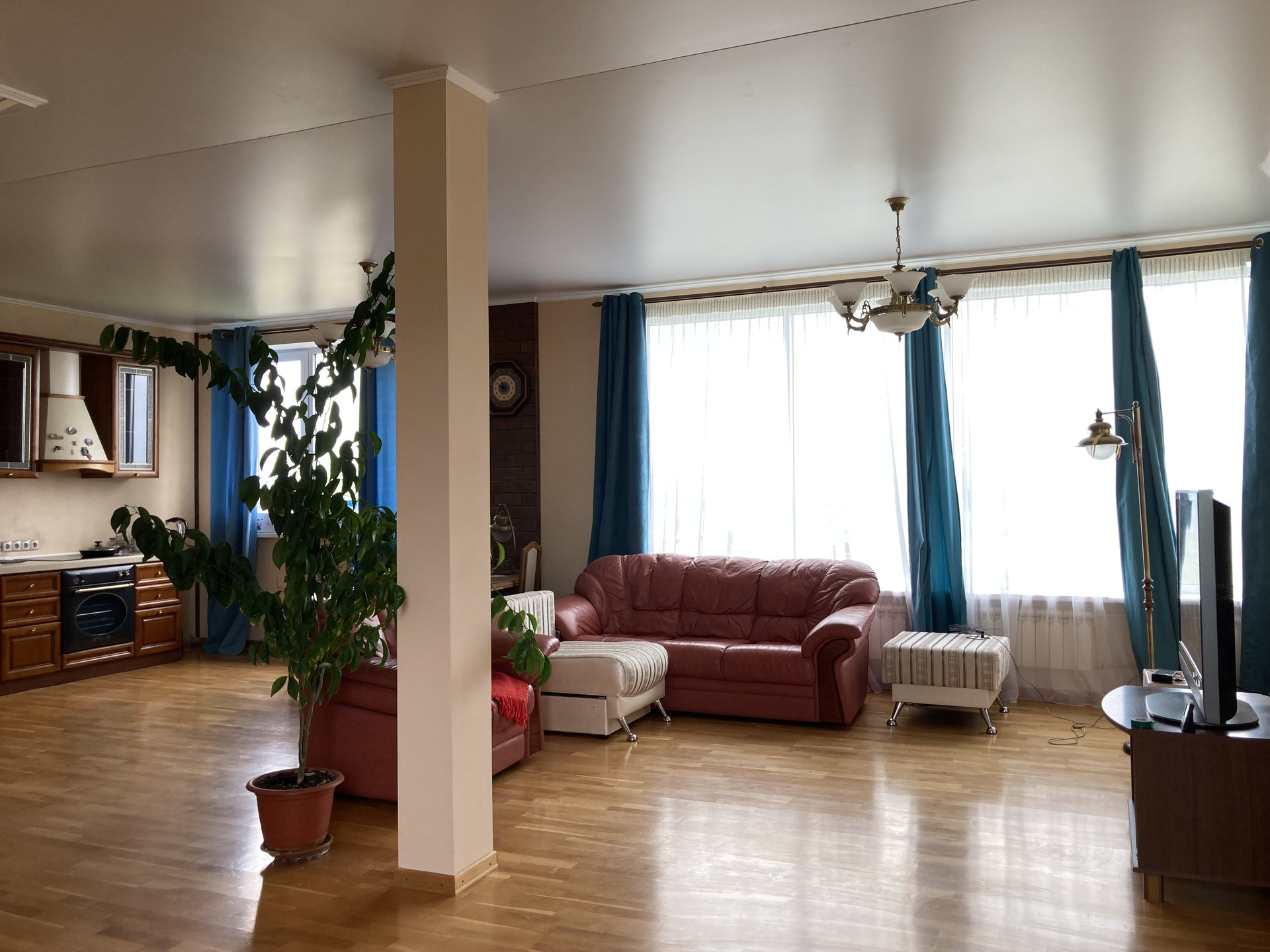2 эт- просторная гостиная-кухня с встроенным дорогим кухонным гарнитуром и панорамными окнами, санузел, холл.