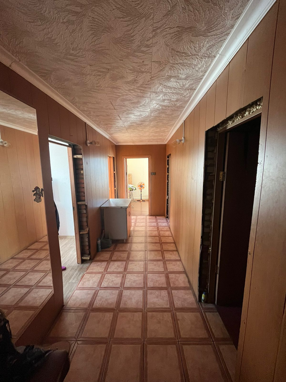 Большой холл спуском в погреб и лестницей на верхний этаж можно обустроить для проживания.