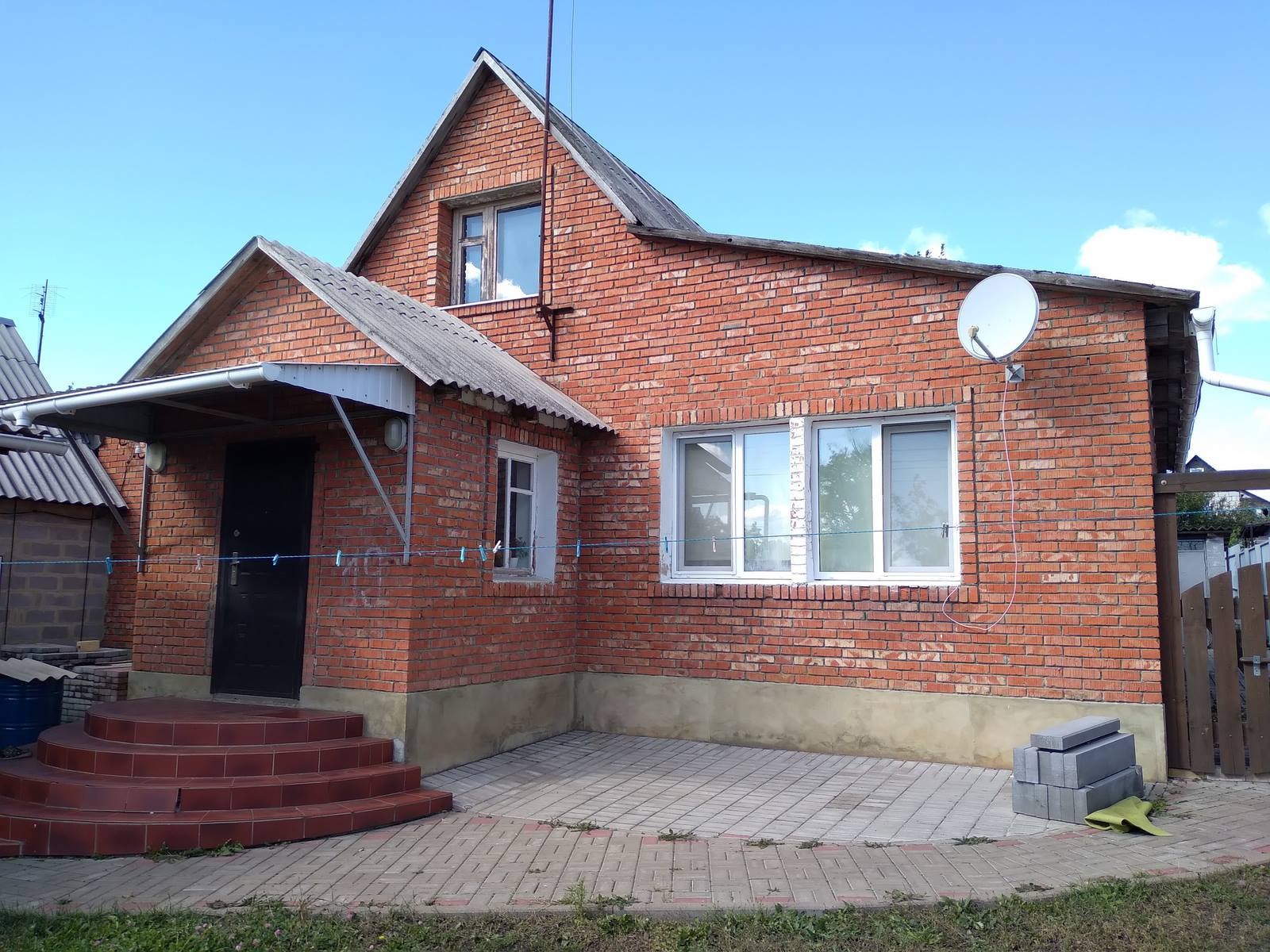 Дом пеноблочный, обложен кирпичом, крыша шифер, 2000 год постройки,  106,9/54,9/16,8 кв.м., хорошая планировка, 3 изолированные жилые комнаты, прихожая, большая кухня, входной коридор. Все коммуникации (газ, свет, сан. узел раздельный, паровое отопление, газовый котел, центральный водопровод, септик). Косметический ремонт, высота потолка 2,7 м., окна ПВХ.  Шлакоблочные надворные постройки под самоотделку: гараж, мастерская, сарай и погреб. Участок 8 соток, двор огорожен по периметру, рядом с домом водоем, центр поселка в шаговой доступности. Рассматривается различная форма оплаты: жилищные сертификаты, материнский капитал, ипотека от Сбербанка России.