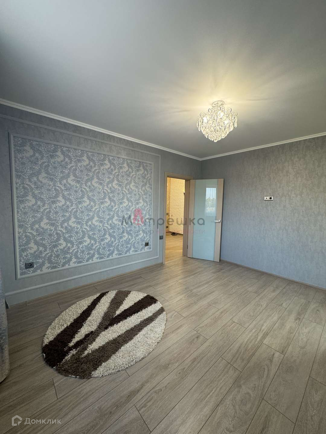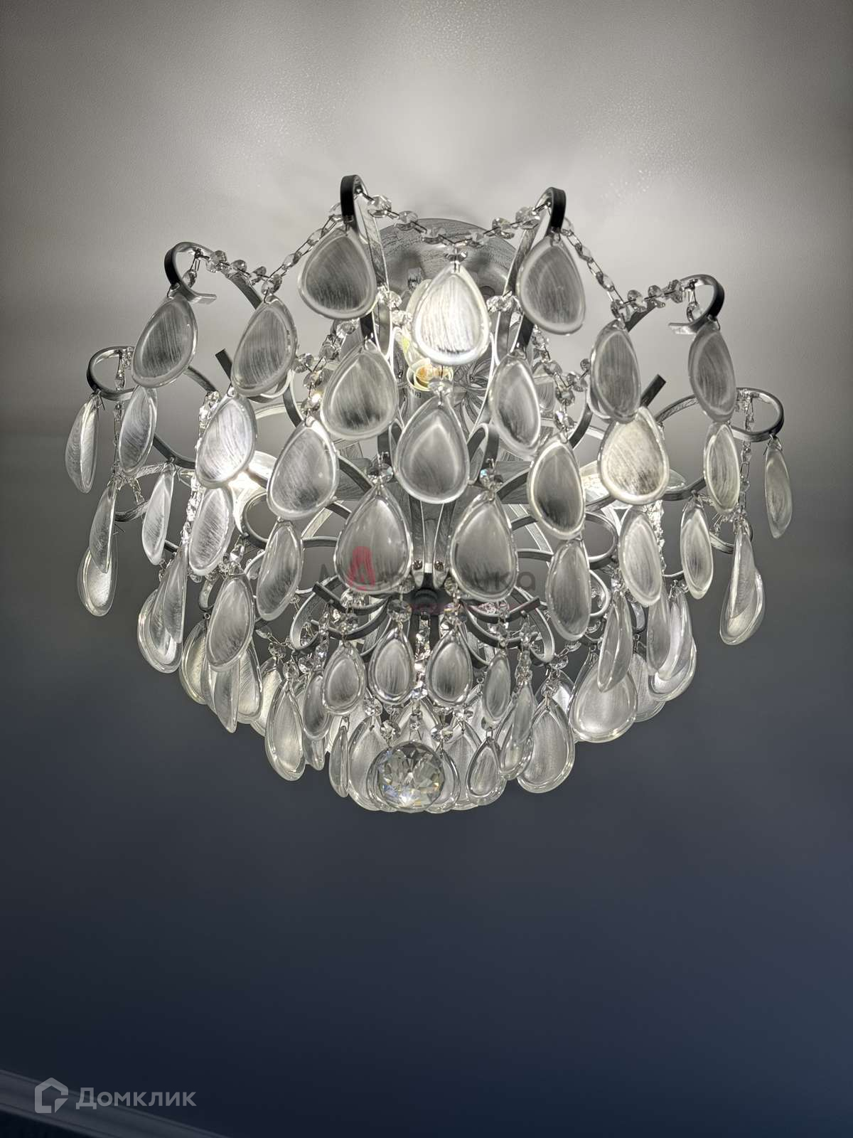 Стильный дизайн выполнен в светлых тонах, уделено внимание фурнитуре, использован многоуровневый свет, люстры и светильники создают оригинальные акценты.