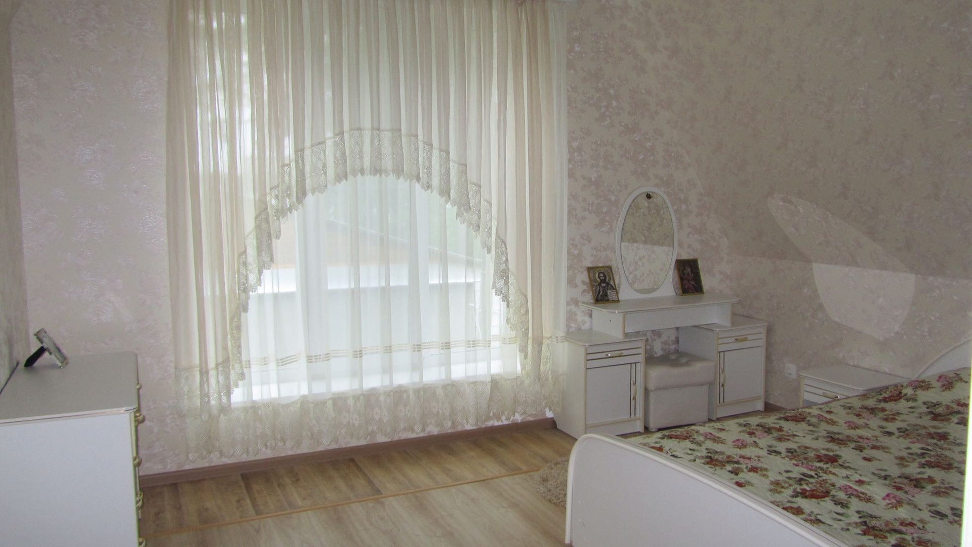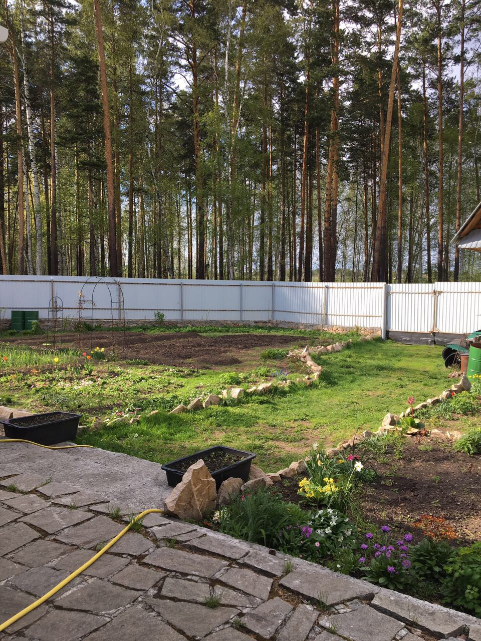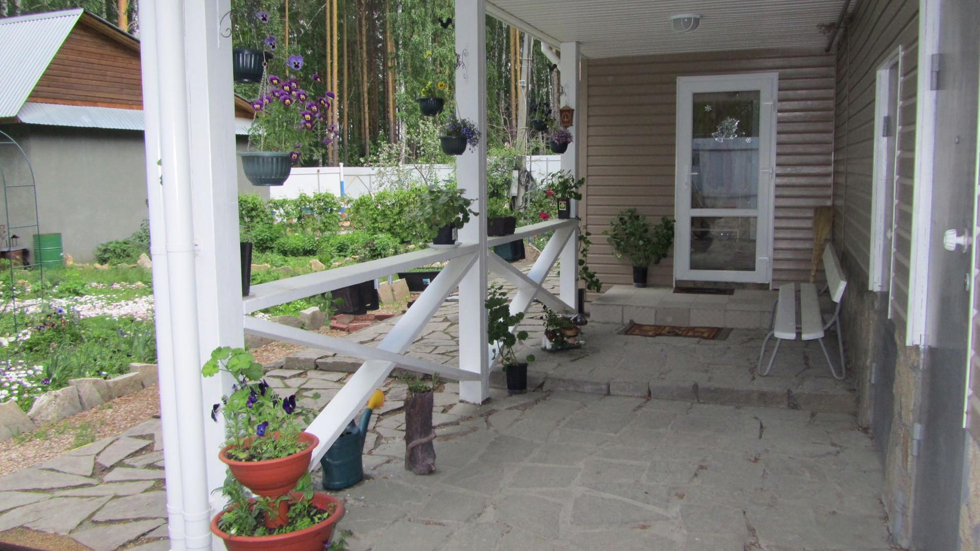 Просторный гараж на 2 машины. Во дворе зона барбекю с навесом. На территории посажены многолетние цветы, яблони и другие кустарники. Земля в частной собственности.