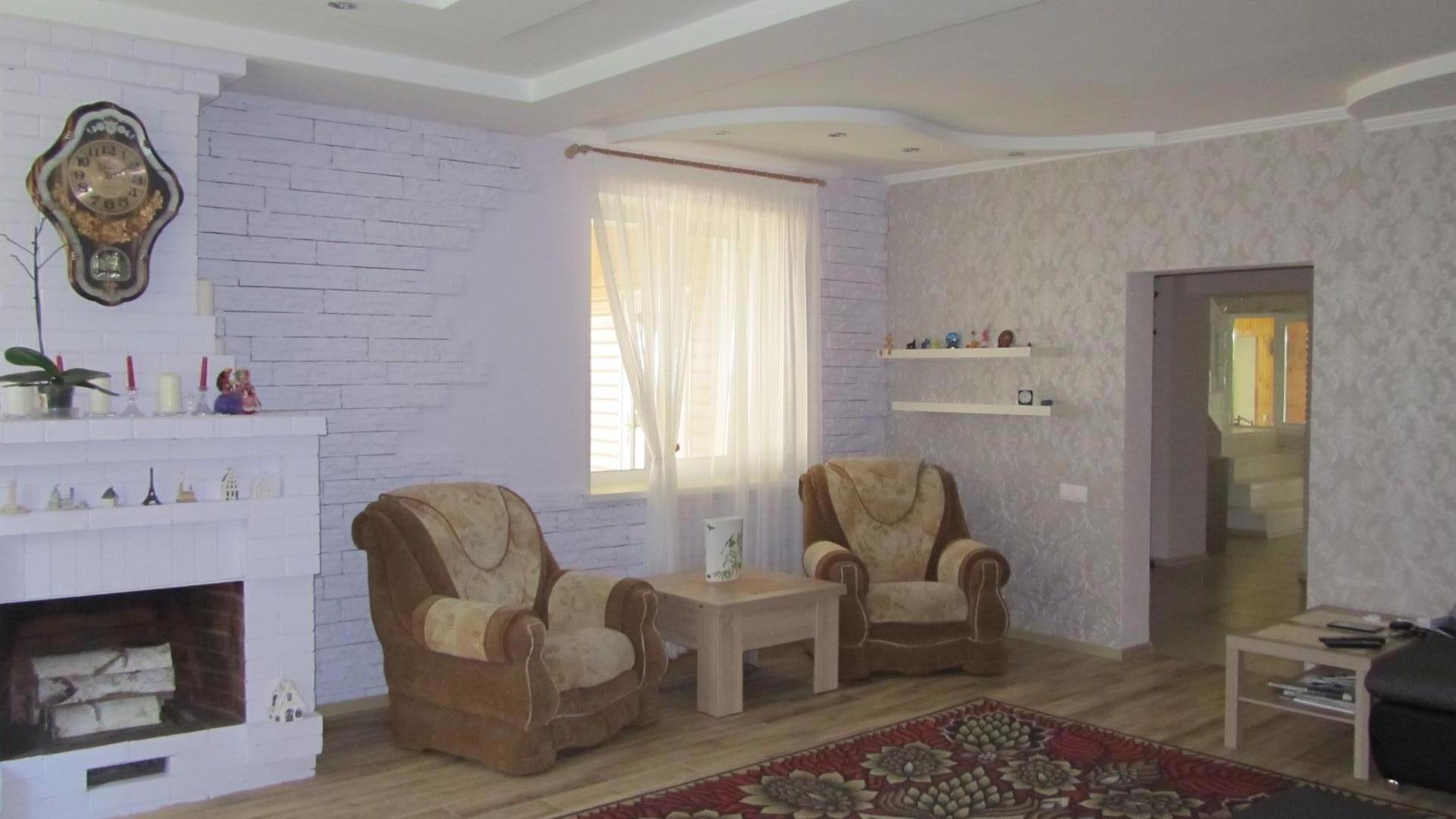 На перовом этаже: гостинная с действующим дровяным камином, большая кухня со встроенной современной техникой, гардеробная - прачечная, баня с глубоким бассейном,душевой и комнатой отдыха (вход в баню из дома), гостевой туалет.