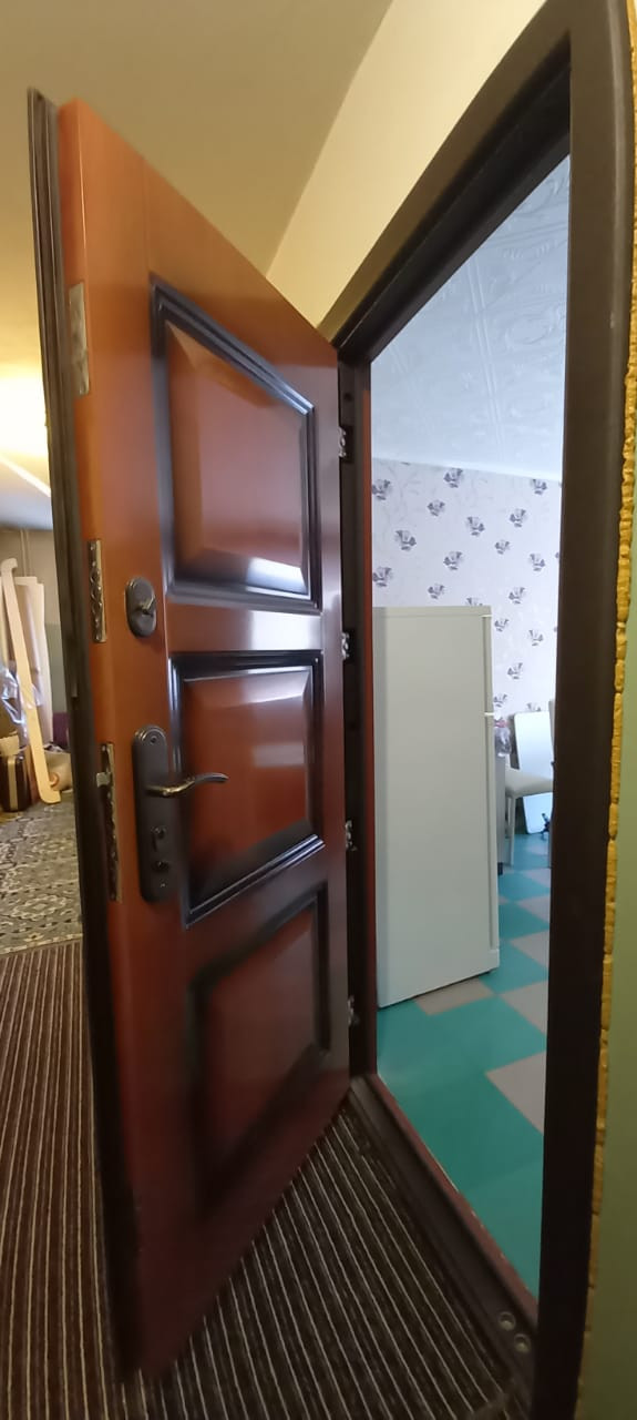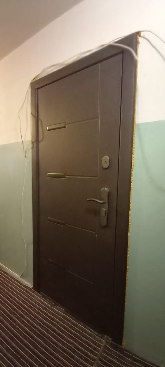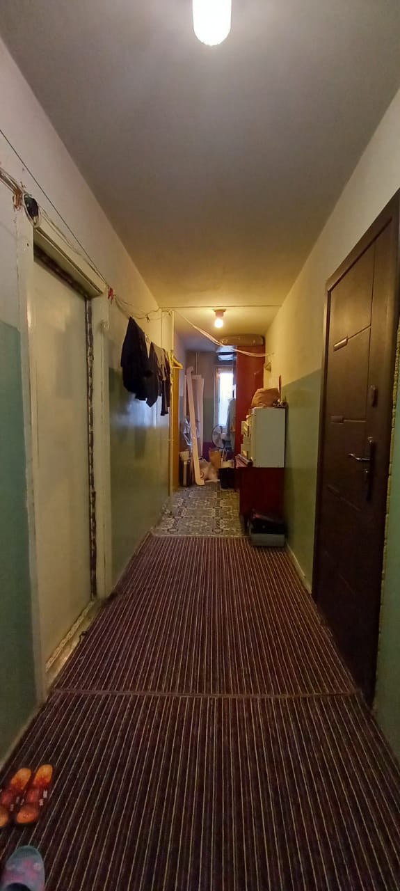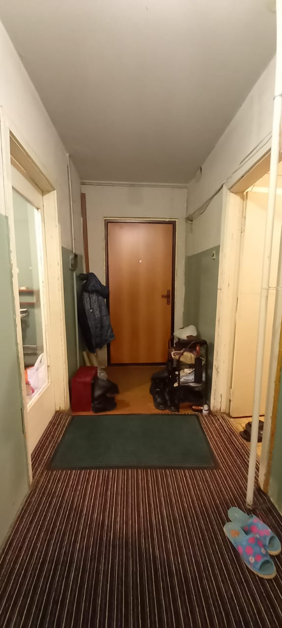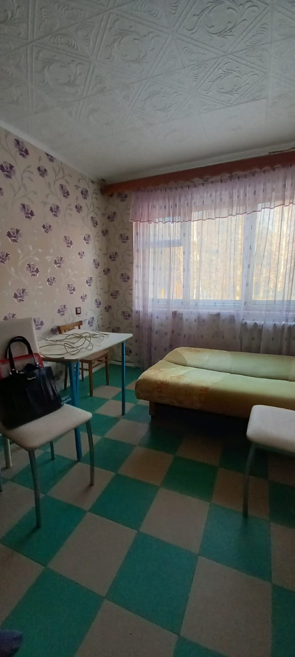 Комната в секции. 12,5 кв. м. Балкона нет. В комнате деревянное большое окно выходит на лес. Установлены Сейф дверь на этаж, Сейф дверь в секцию, Сейф дверь в комнату. В секции общая кухня: своя раковина, своя плита, холодильник. Общее место для стирки, есть место для стиральной машины и индивидуальной раковины. Санузел отдельный, но совмещен (унитаз и ванная). В квартире 4 комнаты: проживают в двух комнатах,  в одной не проживают.