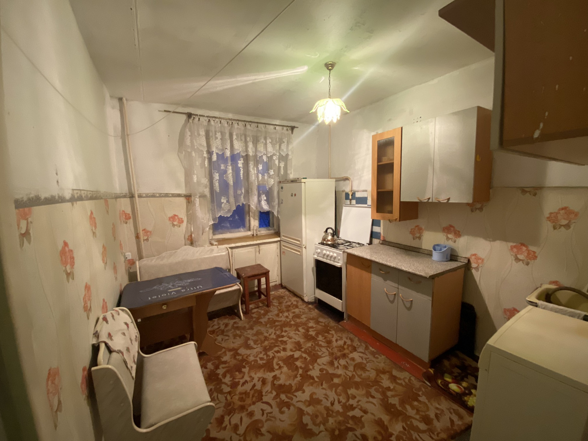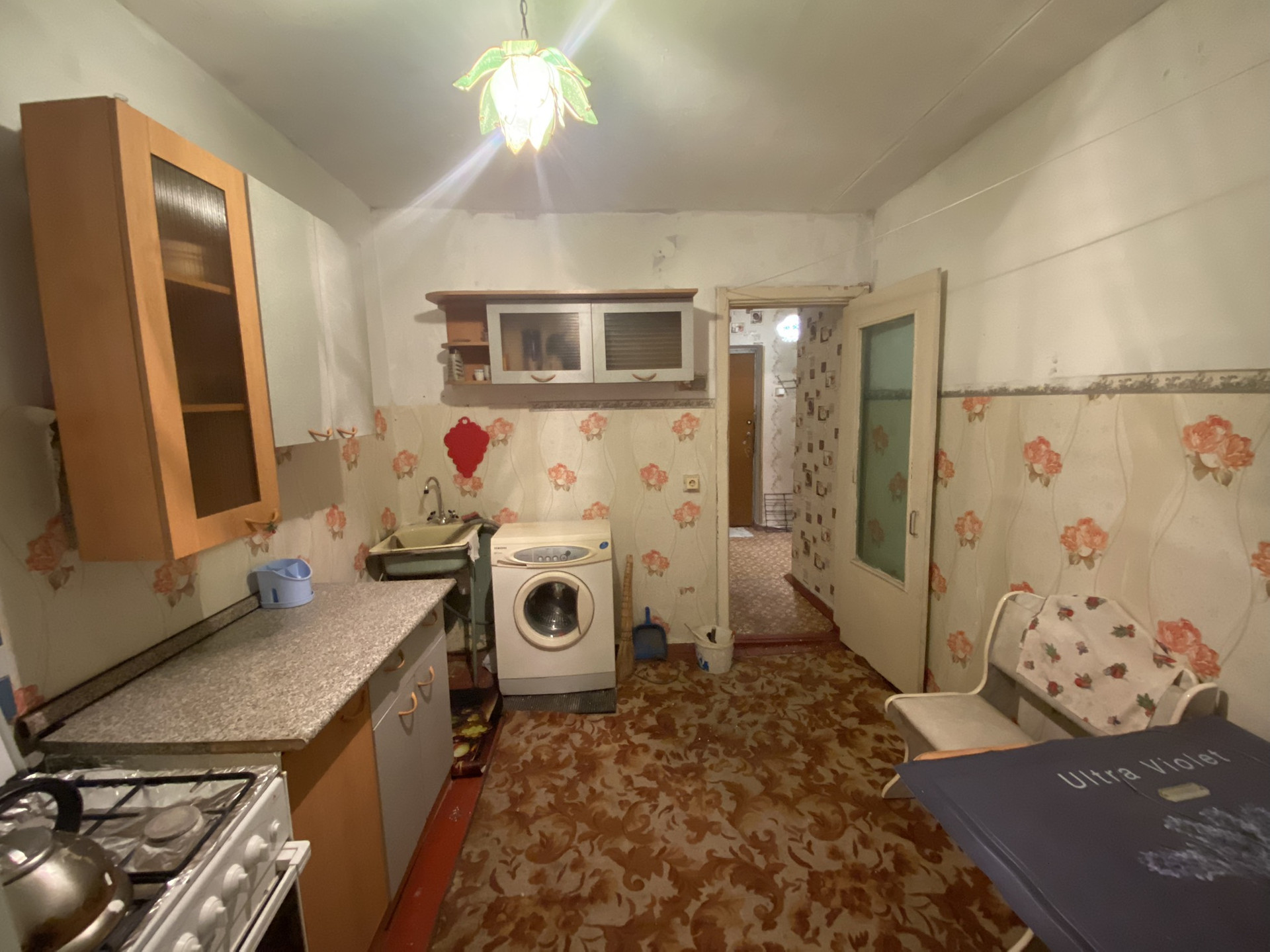Большая комната, просторная кухня, сан.узел совмещен(поменян унитаз), есть вместительная кладовка.
