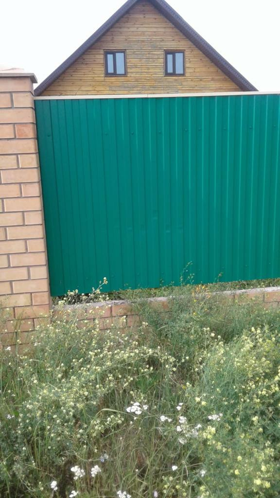 Дом с приусадебным участком огорожен забором из профнастила.