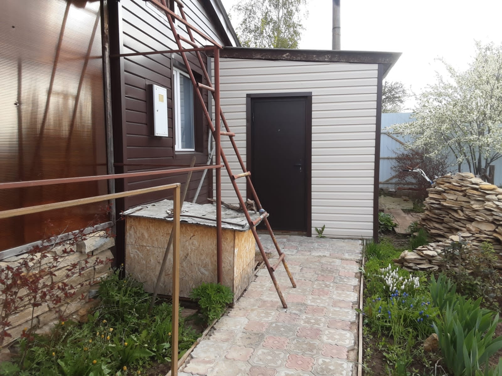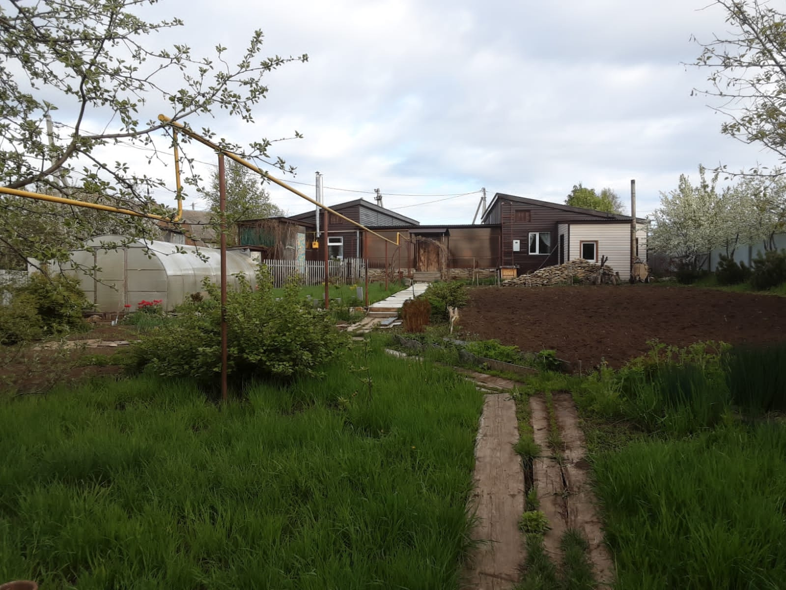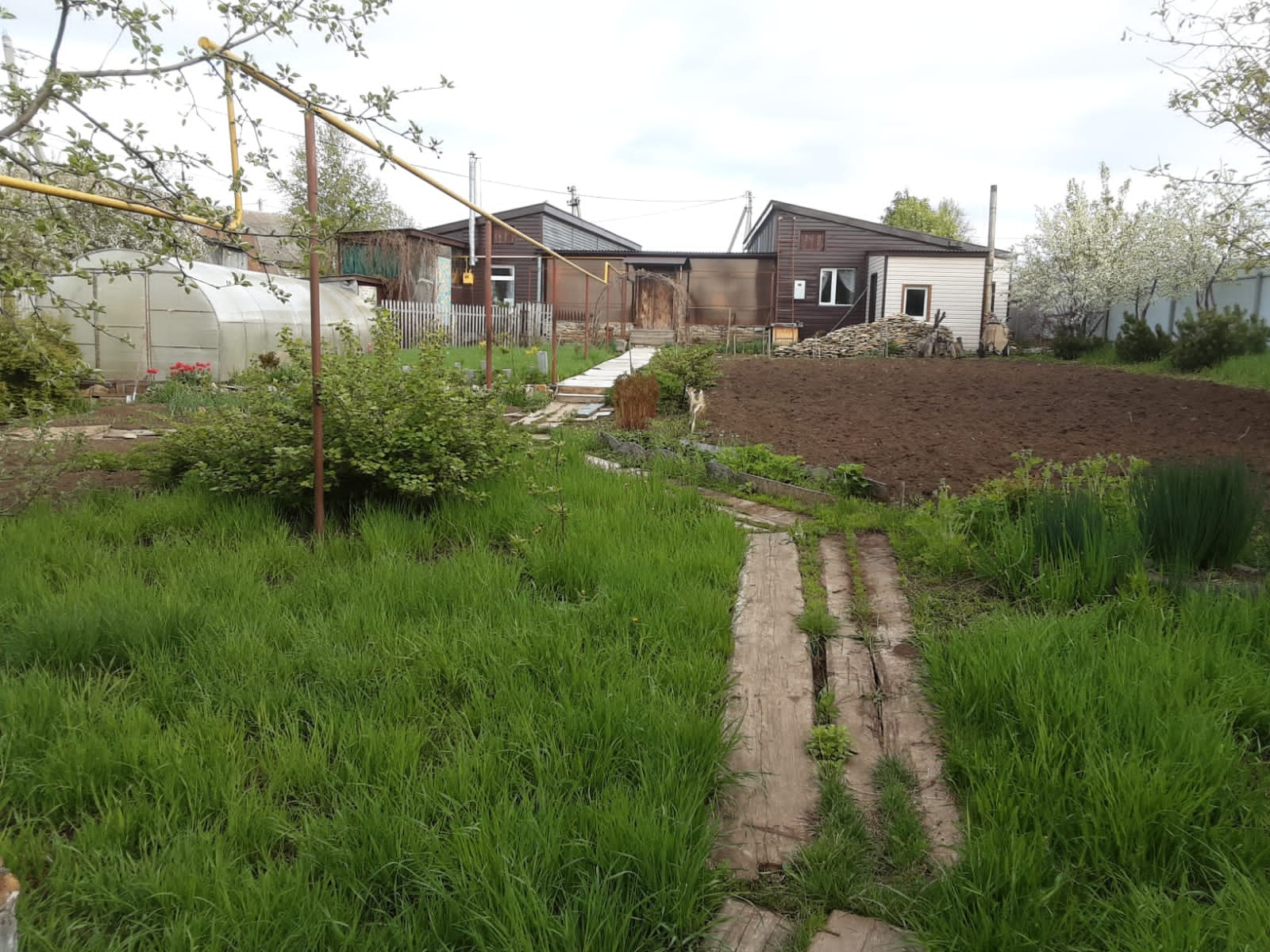 На участке большая теплица, ухоженный сад.