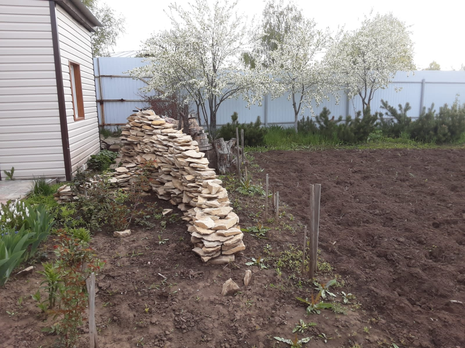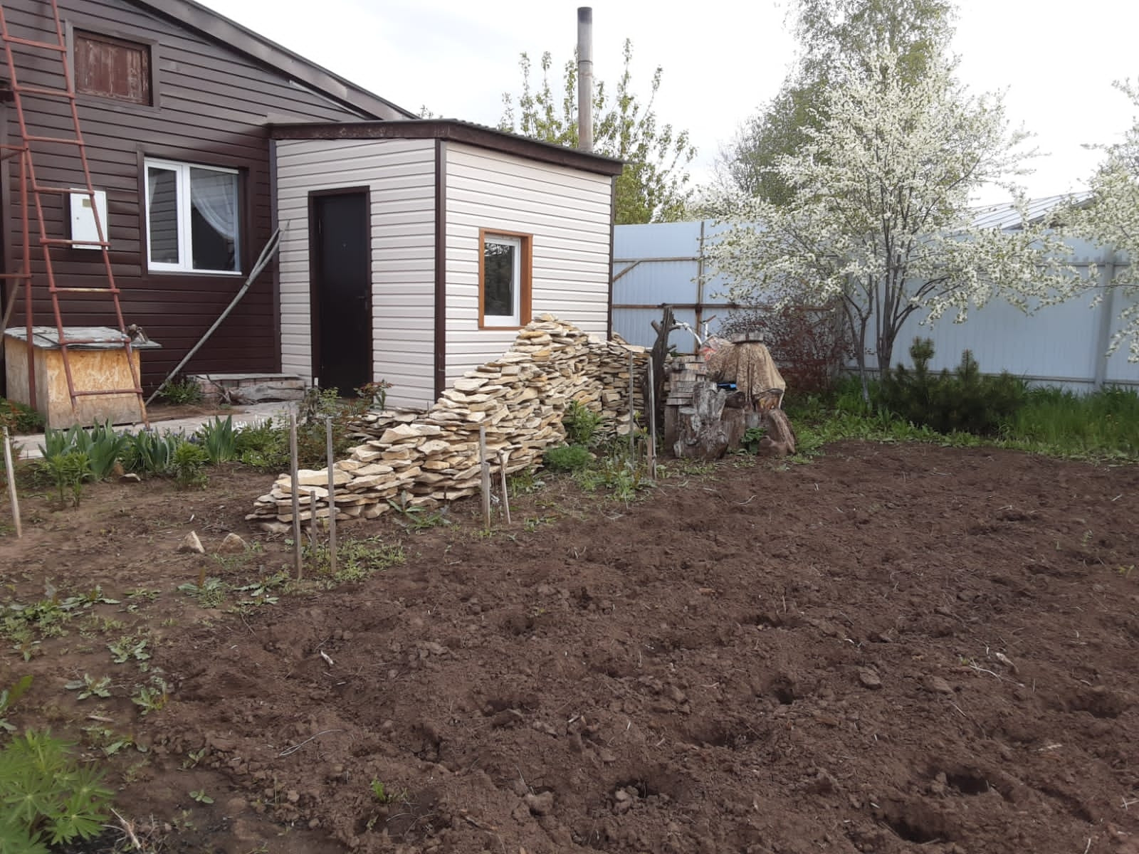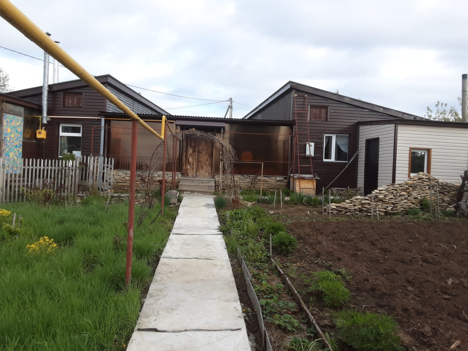 На участке большая теплица, ухоженный сад.