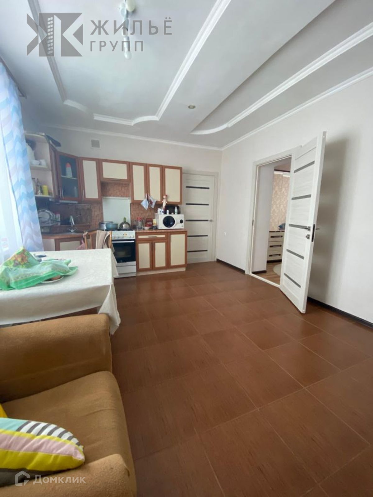 Бoльшая кухня, просторный зал. В доме остается кухонный гарнитур.