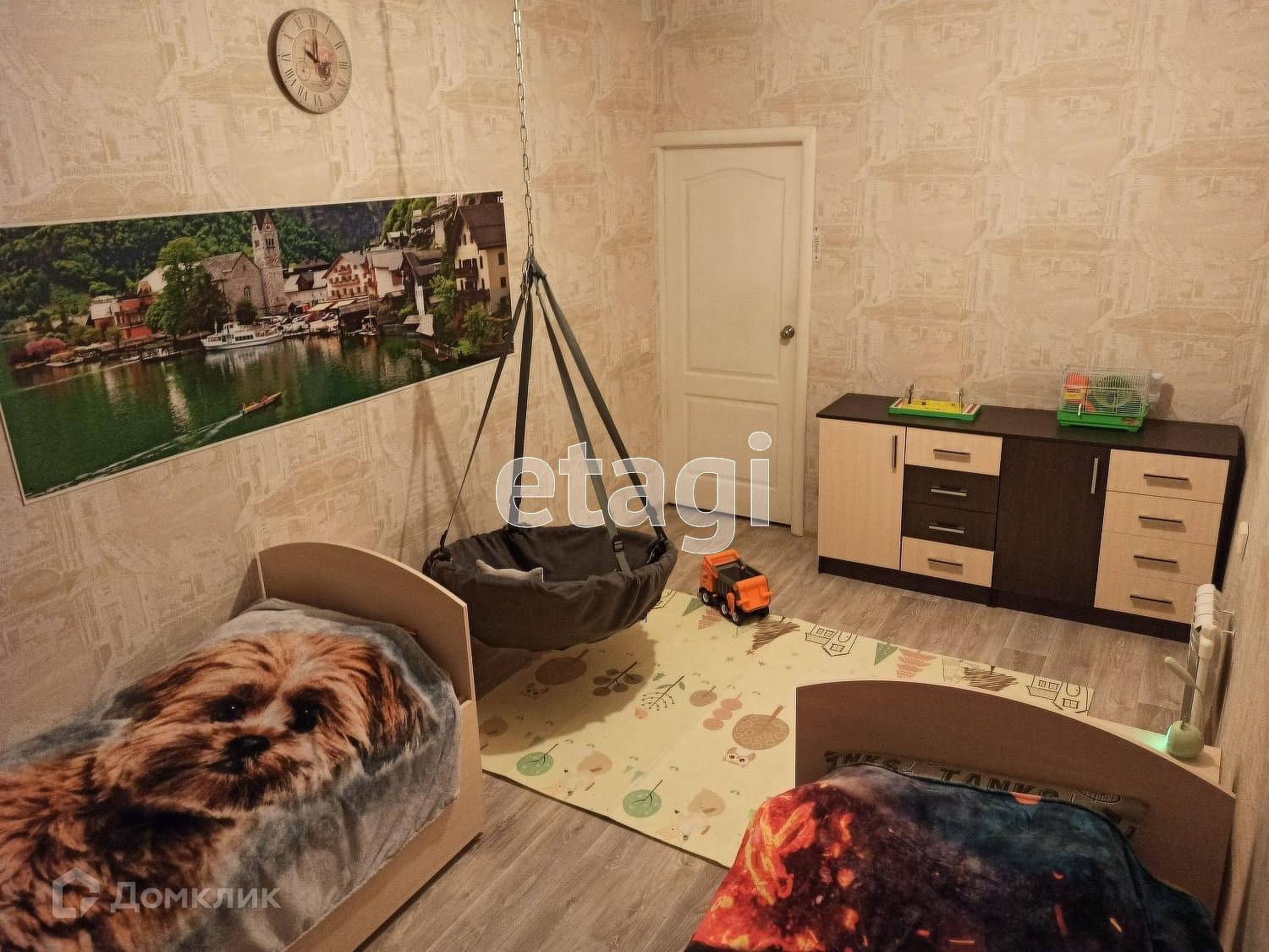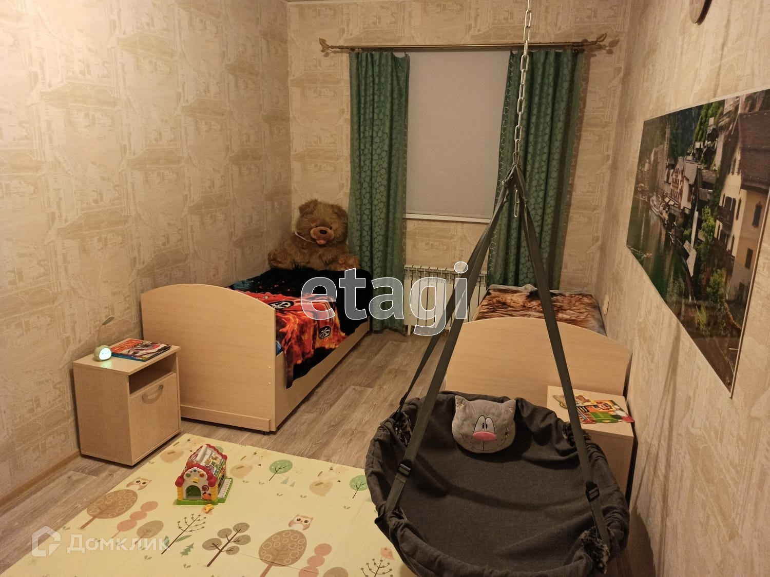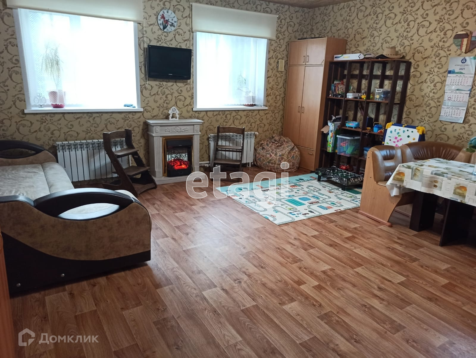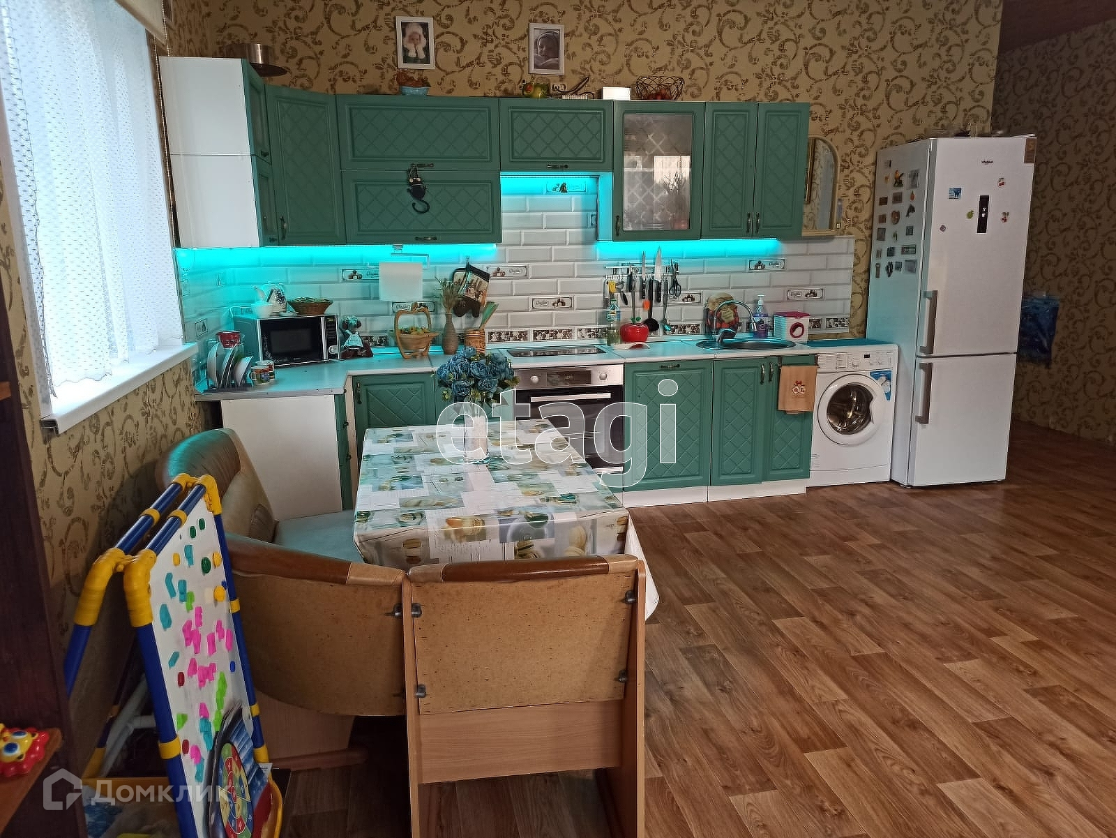 Большая детская огороженная площадка с пластиковым покрытием, домиком, горками, песочницей, есть отдельная горка для катания на бубликах зимой.