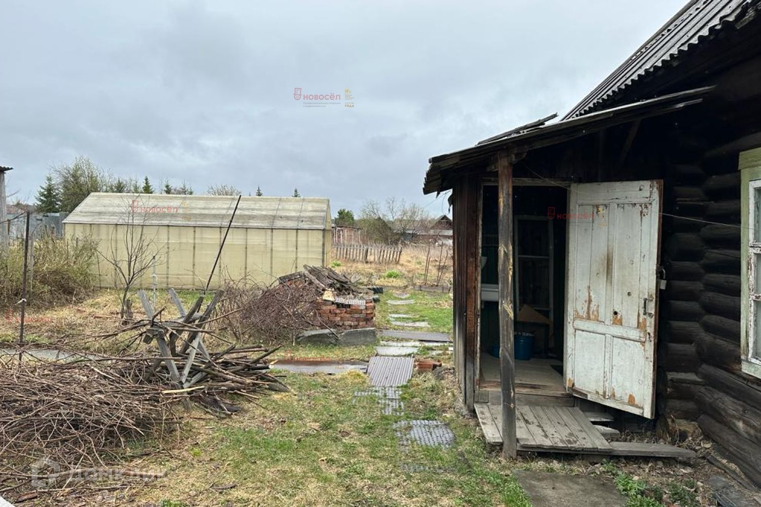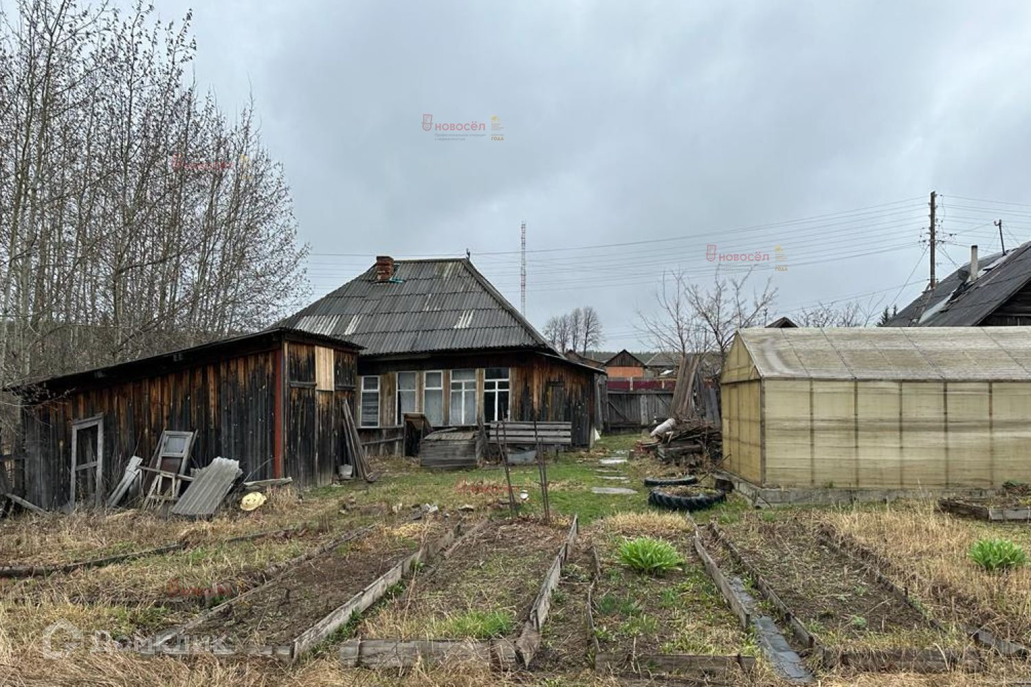 Есть две теплицы, большой участок земли, многолетние насаждения: жимолость, смородина, вишня.