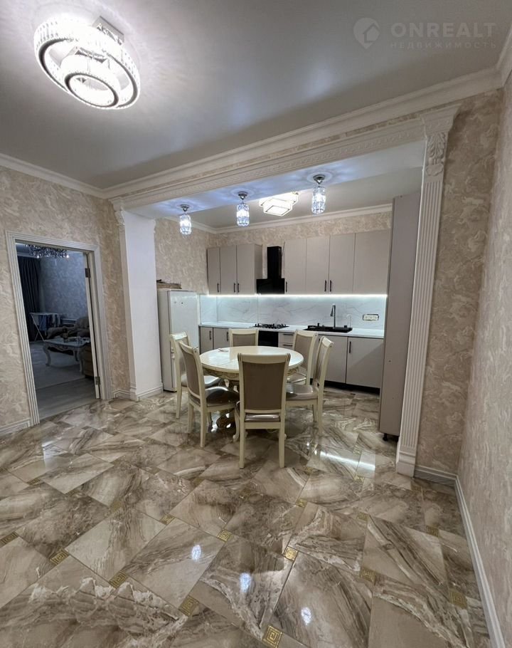 Кухня просторная с дорогой мебелью.