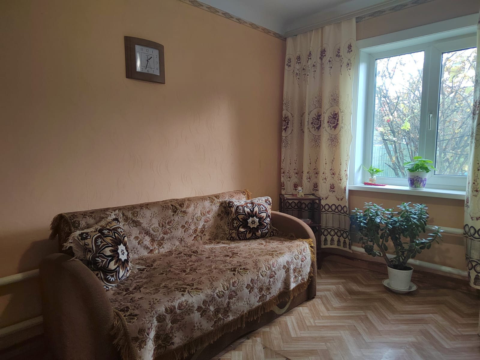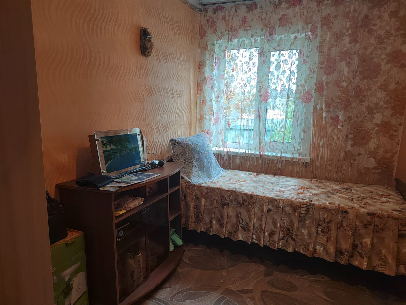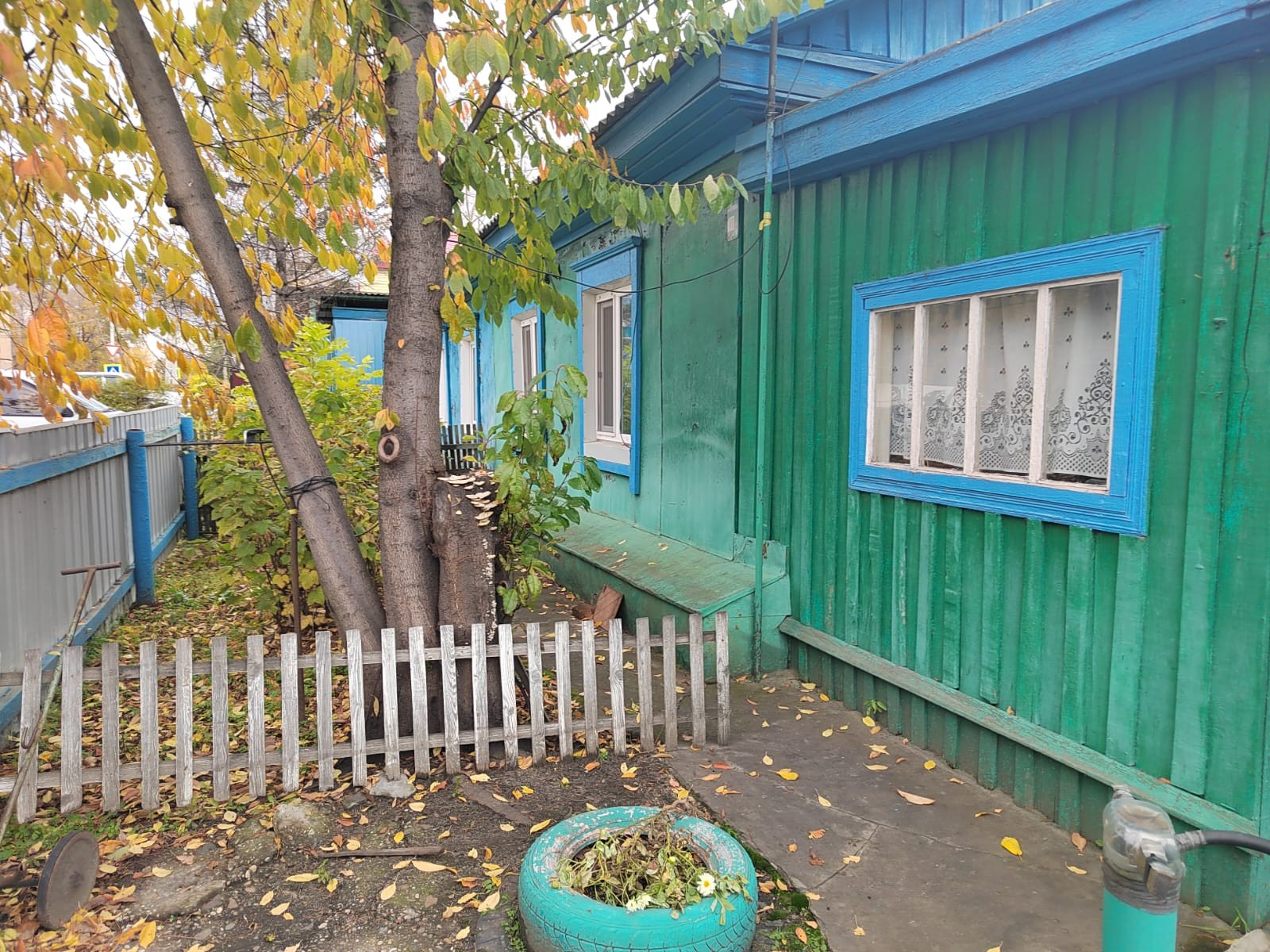 Этот дом расположен в уютном жилом районе, практически в самом центре города. Его фасад выглядит очень аккуратно и ухоженно.  Дом одноэтажный, крыша выполнена в форме скатной, которая прекрасно сочетается с остальными элементами здания. Окна квартиры, которые находятся в этом доме украшаются бело-голубыми рамами.