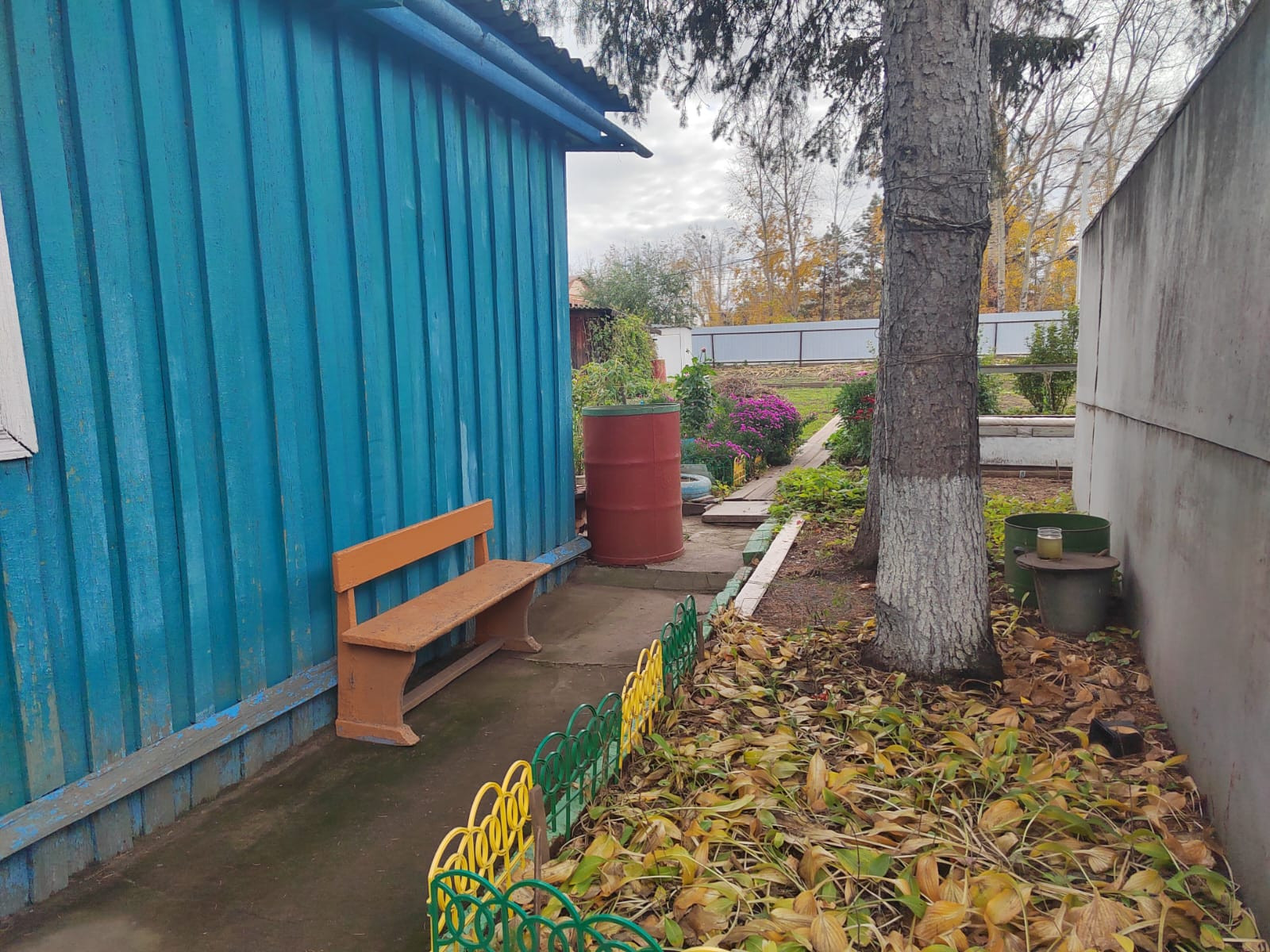 Окружающая территория также является привлекательной. Она утопает в зелени, благодаря богатому озеленению и красиво оформленным клумбам. На газоне перед домом стоит маленькая скамейка, что создает ощущение приватности и безопасности. Неподалеку от дома тянется деревянный забор, который делит участок на две части.