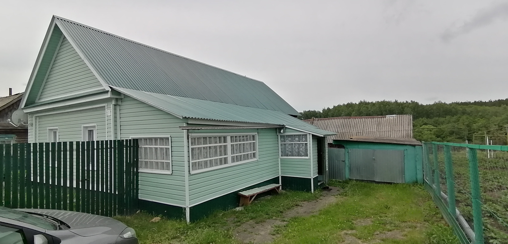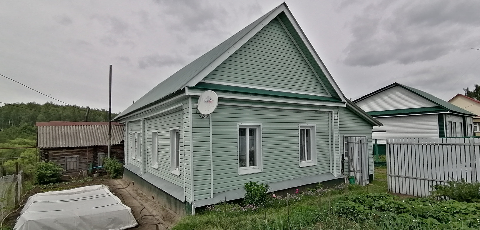 дом срубовой, одноэтажный, обшит сайдингом, пристрой кирпичный, площадь 60,8 кв.м., площадь земельного участка- 815 кв.м., все в собственности, в доме электричество, газ, отопление, централизованное водоснабжение, септик, сан.узел в доме, состояние хорошее, жилое, пластиковые окна, две комнаты и кухня, есть баня, погреб и надворные постройки.