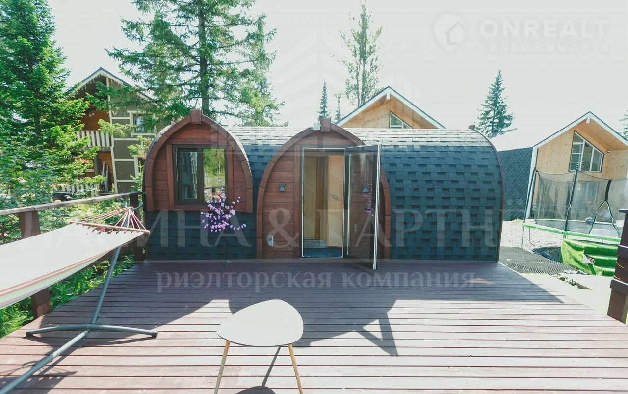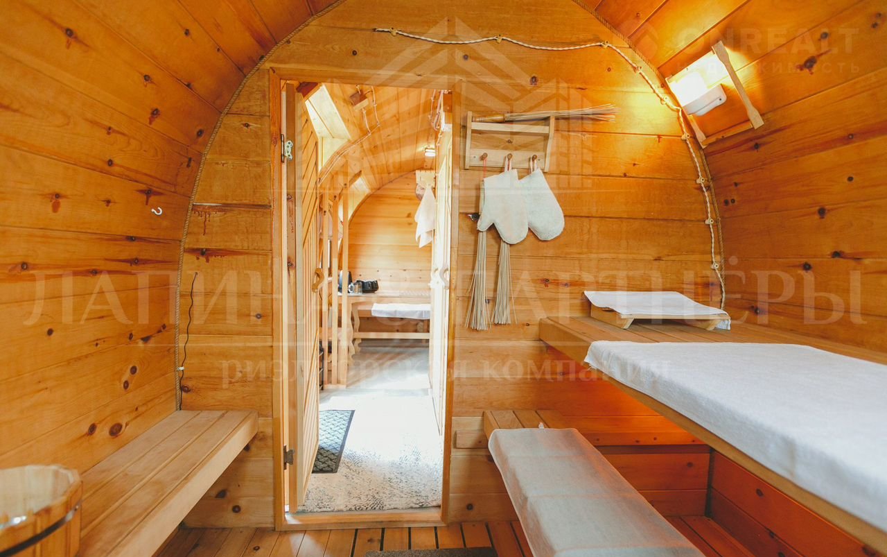 Баня выполнена в уникальном архитектурном решении “Viking” из сибирской сосны и рассчитана на компанию до 6 человек.