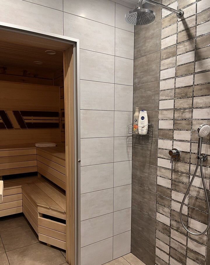 На первом этаже: входной тамбур для сушки снаряжения , просторная гостиная с панорамными окнами и большим раздвижным диваном на 2 места, обеденная зона с большим столом , душевая, туалет, отличная сауна ( оплачивается отдельно)