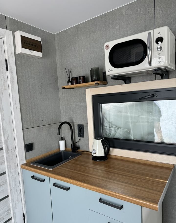 Кухонная зона (индукционная плита, чайник, микроволновка и кухонные принадлежности)