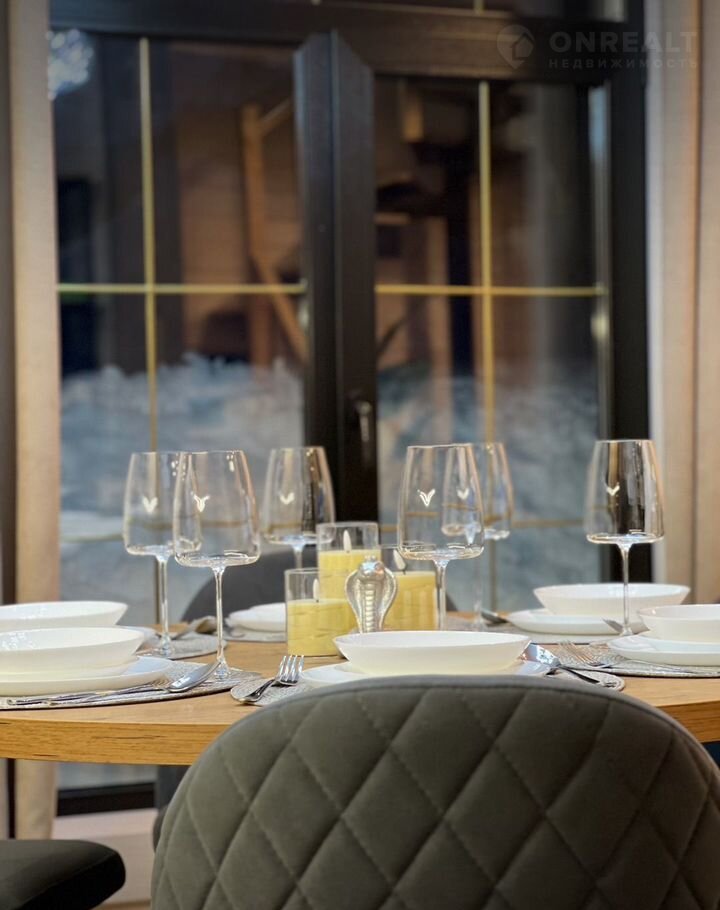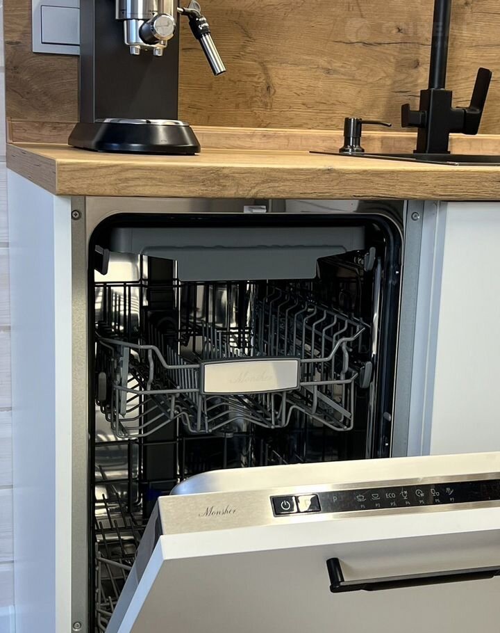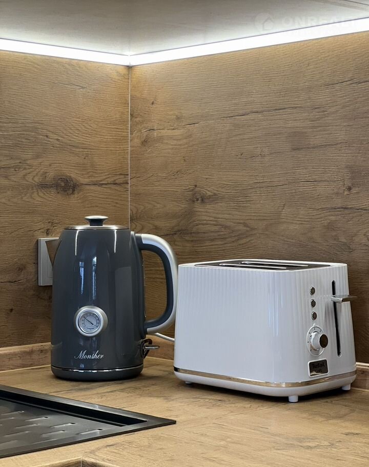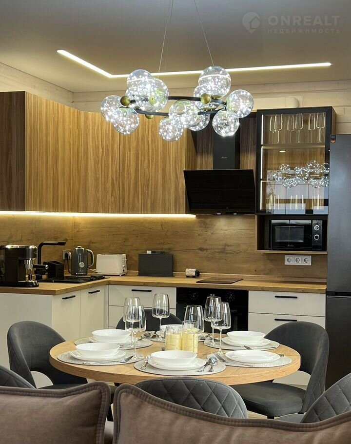 Кухонная зона полностью оборудована всей необходимой бытовой техникой ( холодильник, индукционная плита, духовой шкаф, микроволновая печь, чайник (чай, сахар), тостер, посудомоечная машина, таблетки для посудомоечной машины, кофемашина (кофе для кофемашины)) и мебелью (кухонный гарнитур, круглый обеденный стол, удобные стулья-кресла, красивая посуда и бокалы).