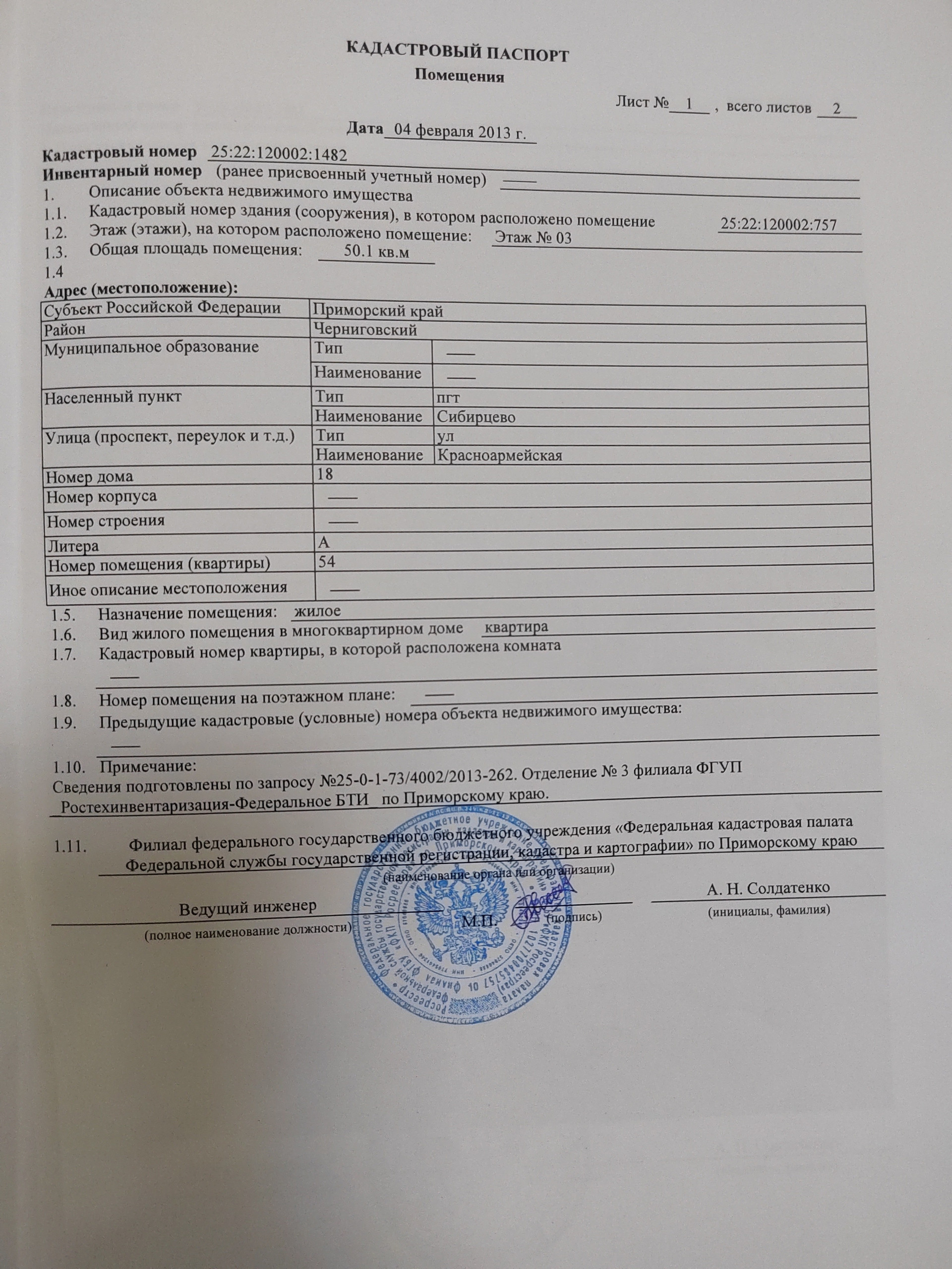 2-комнатная квартира, 50.1 м2, этаж 3 / 5, на продажу в посёлке городского типа Сибирцево, Красноармейская улица, 18