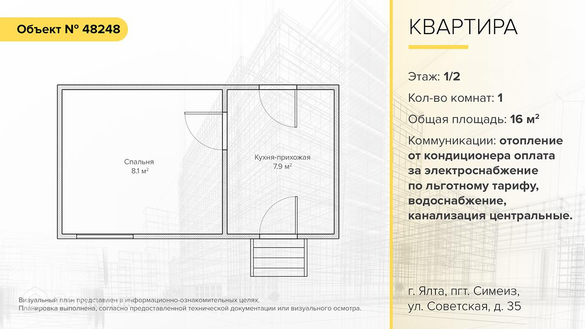 Предлагаем Вашему вниманию малогабаритную 1-комнатную квартиру в городе Ялта, поселок городского типа Симеиз, улица Советская, дом 35. Расположена на 1 этаже 2-этажного дома. Общая площадь 16 м2. Спальная комната 8,1 м2, кухня- прихожая 7,9 м2.