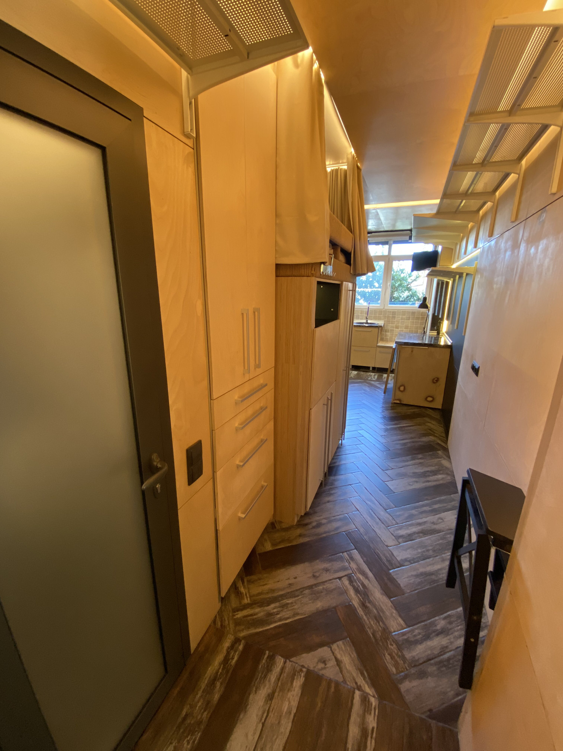 Состоит студия из зоны спальни, кухни, сан.узла и коридора.