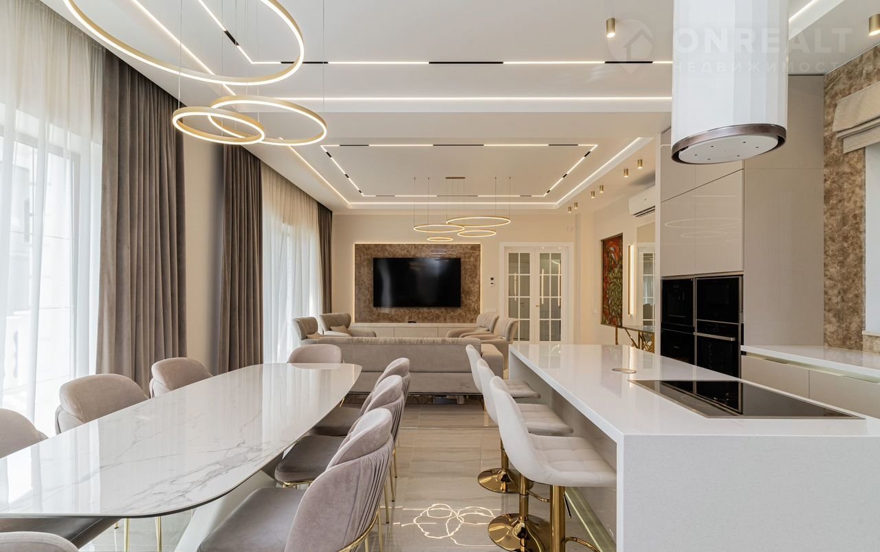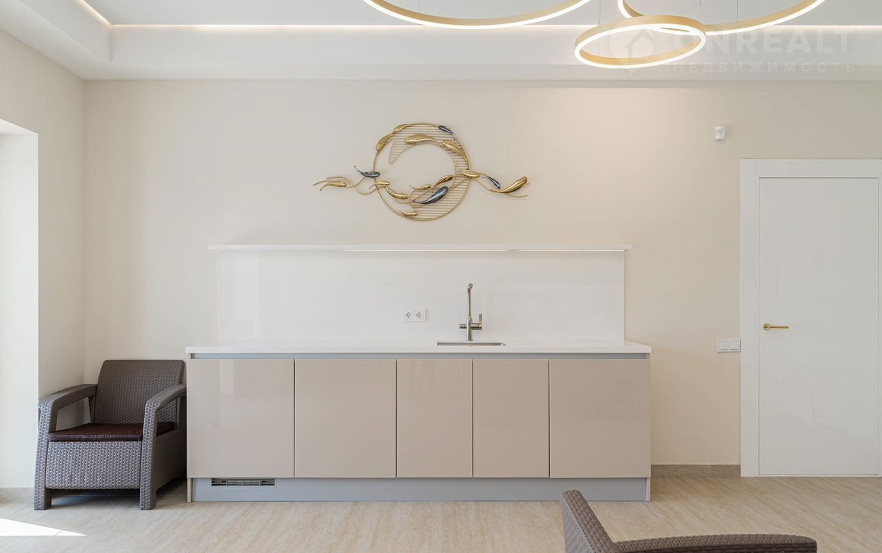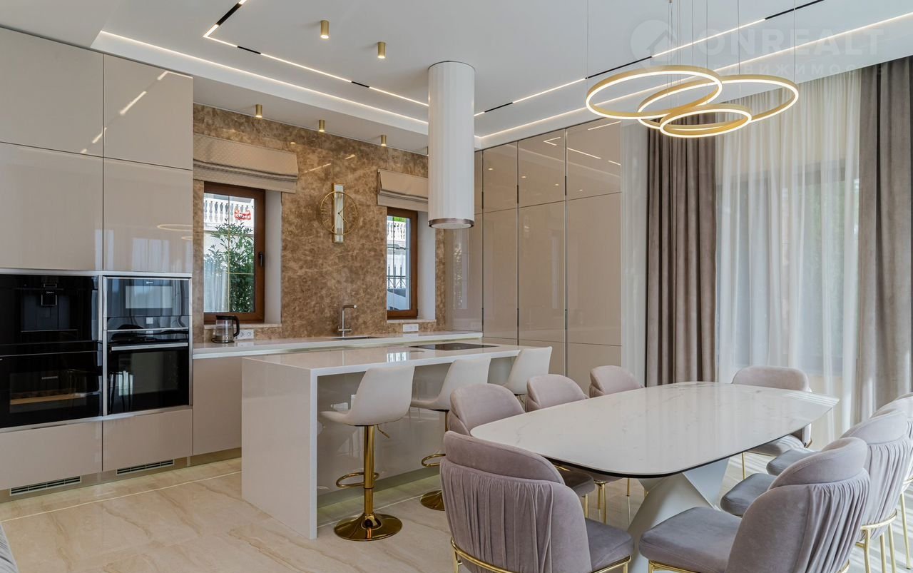 кухня оборудована современной встроенной техникой (микроволновая печь, духовой шкаф, кофе машина, винный шкаф, варочная индукционная панель, посудомоечная машина, сушилка для посуды, две встроенные холодильные камеры. Также есть наличие всех необходимых кухонных приборов, посуды и стекла.