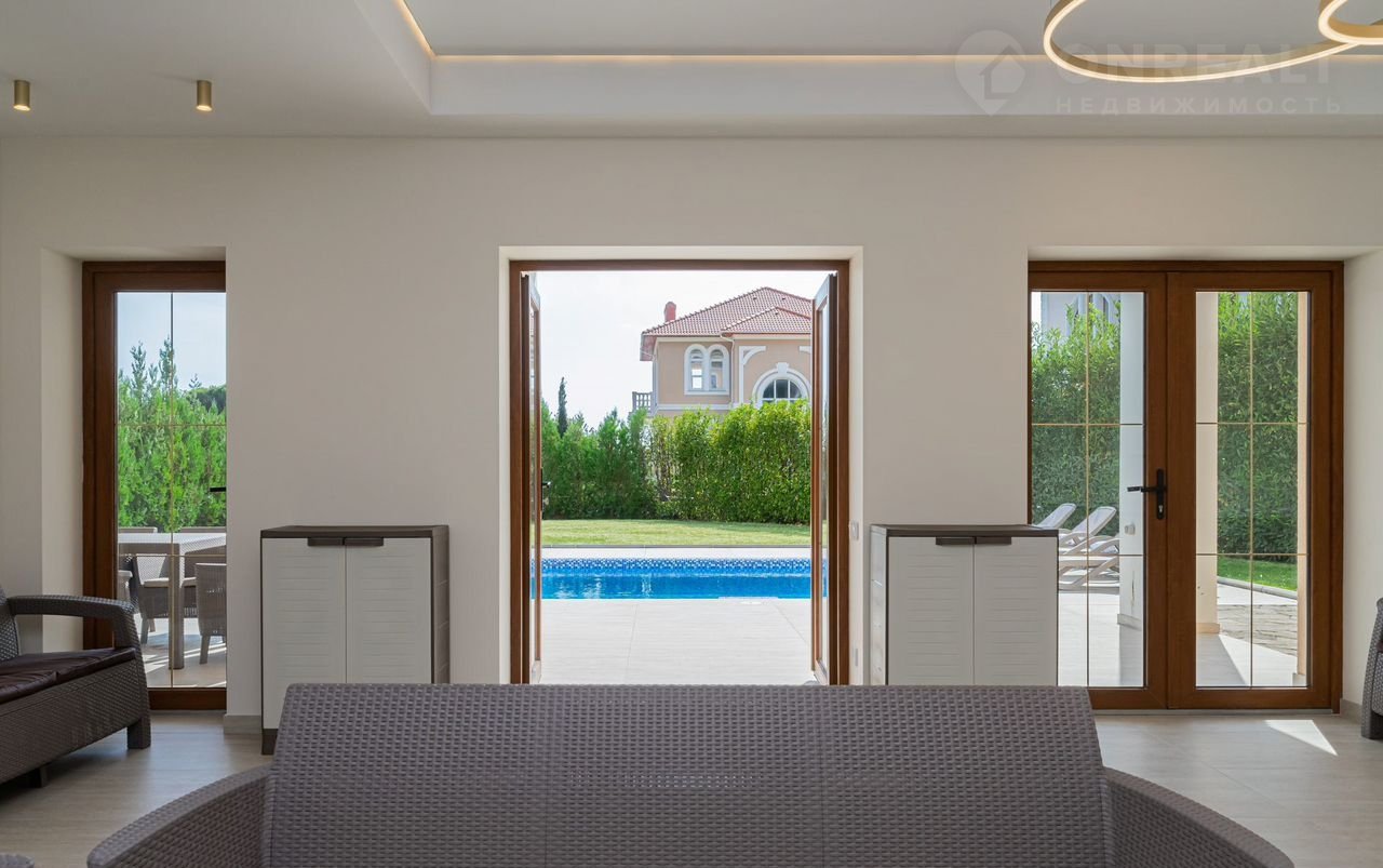 - Панорамное остекление с выходом к бассейну;