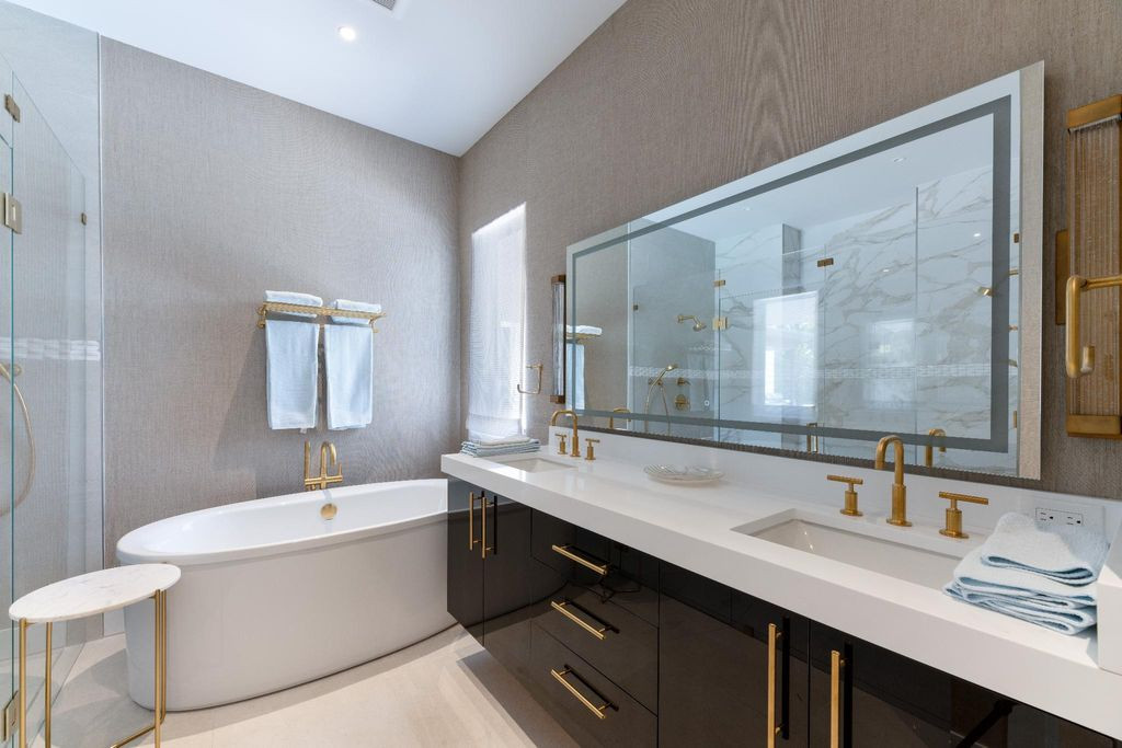 Внутри дома, роскошное наполнение. Доступ по биометрическому замку. Огромная прихожая и большой зал с барной стойкой и винным шкафом, сауна с ванной комнатой, оборудованной гидромассажной панелью на первом этаже.
