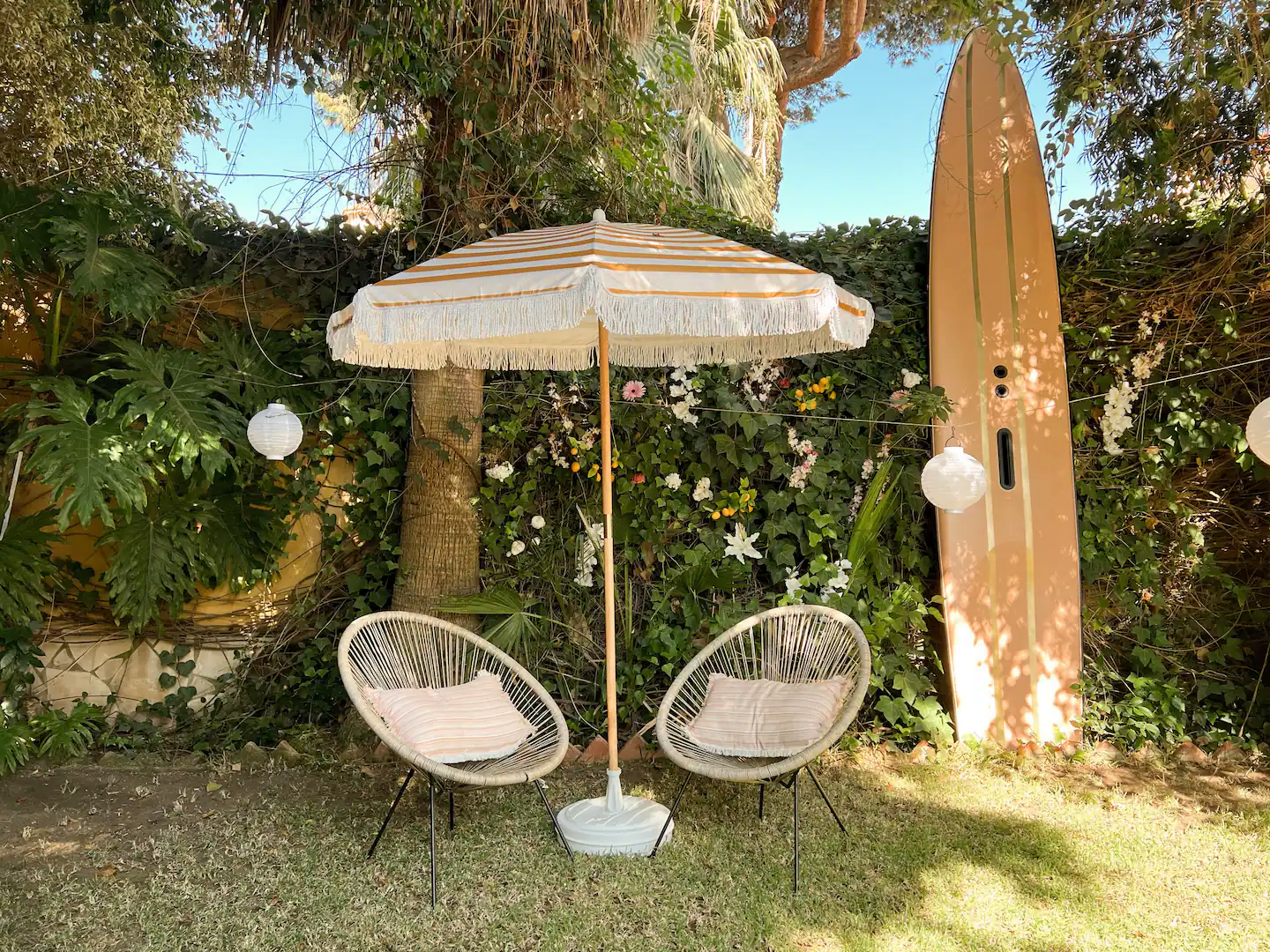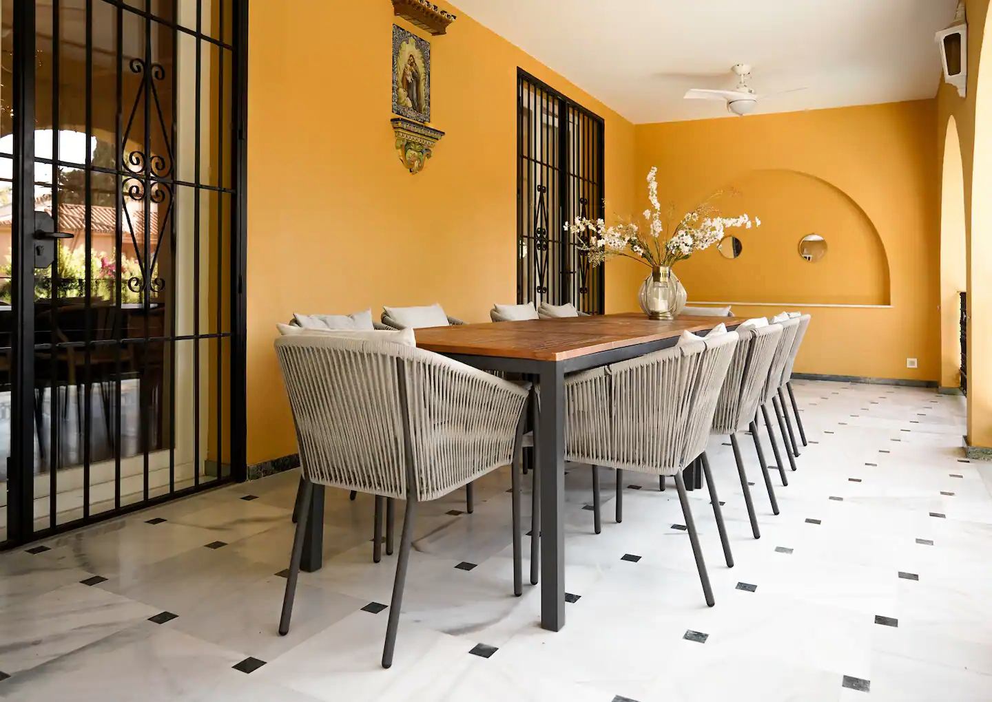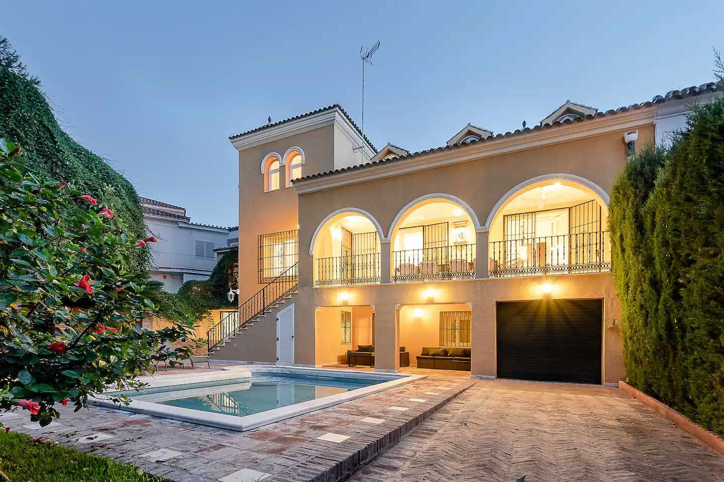 На участке выполнено ландшафтное озеленение с автополивом, размещены круглогодичный подогреваемый бассейн, летняя кухня с зоной барбекю, зона отдыха с лежаками, гараж на два автомобиля. Фасад виллы и участок в ночное время освещаются дизайнерской подсветкой.