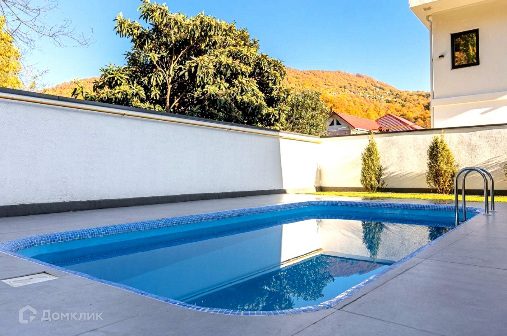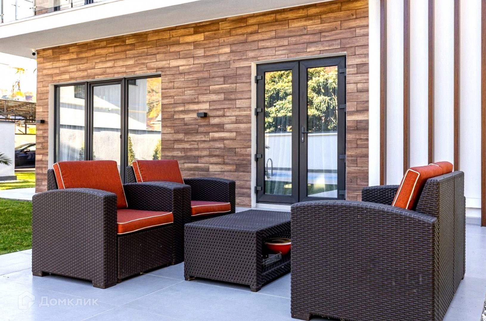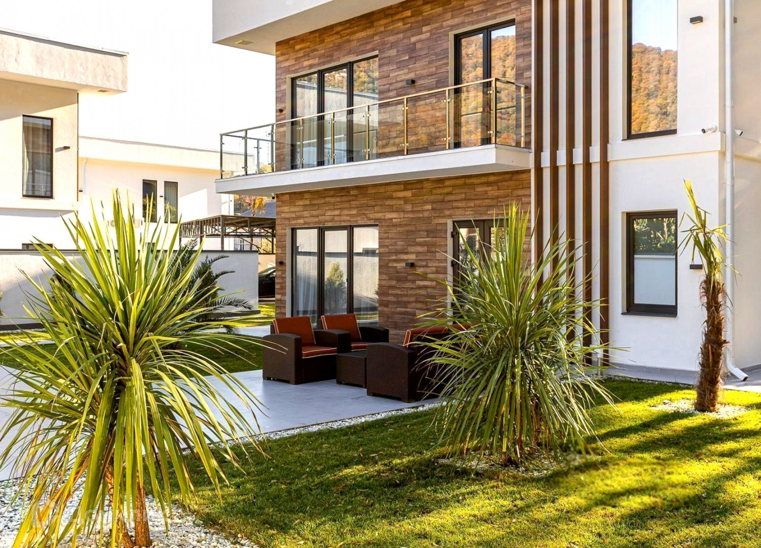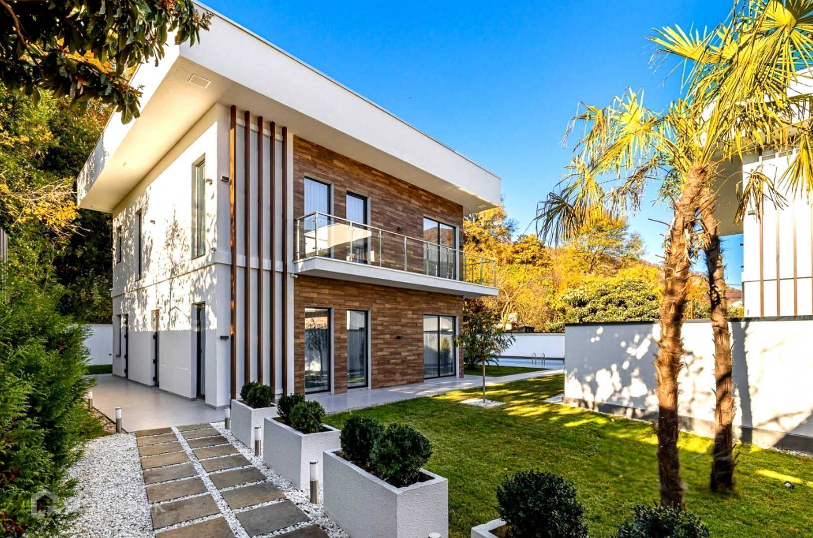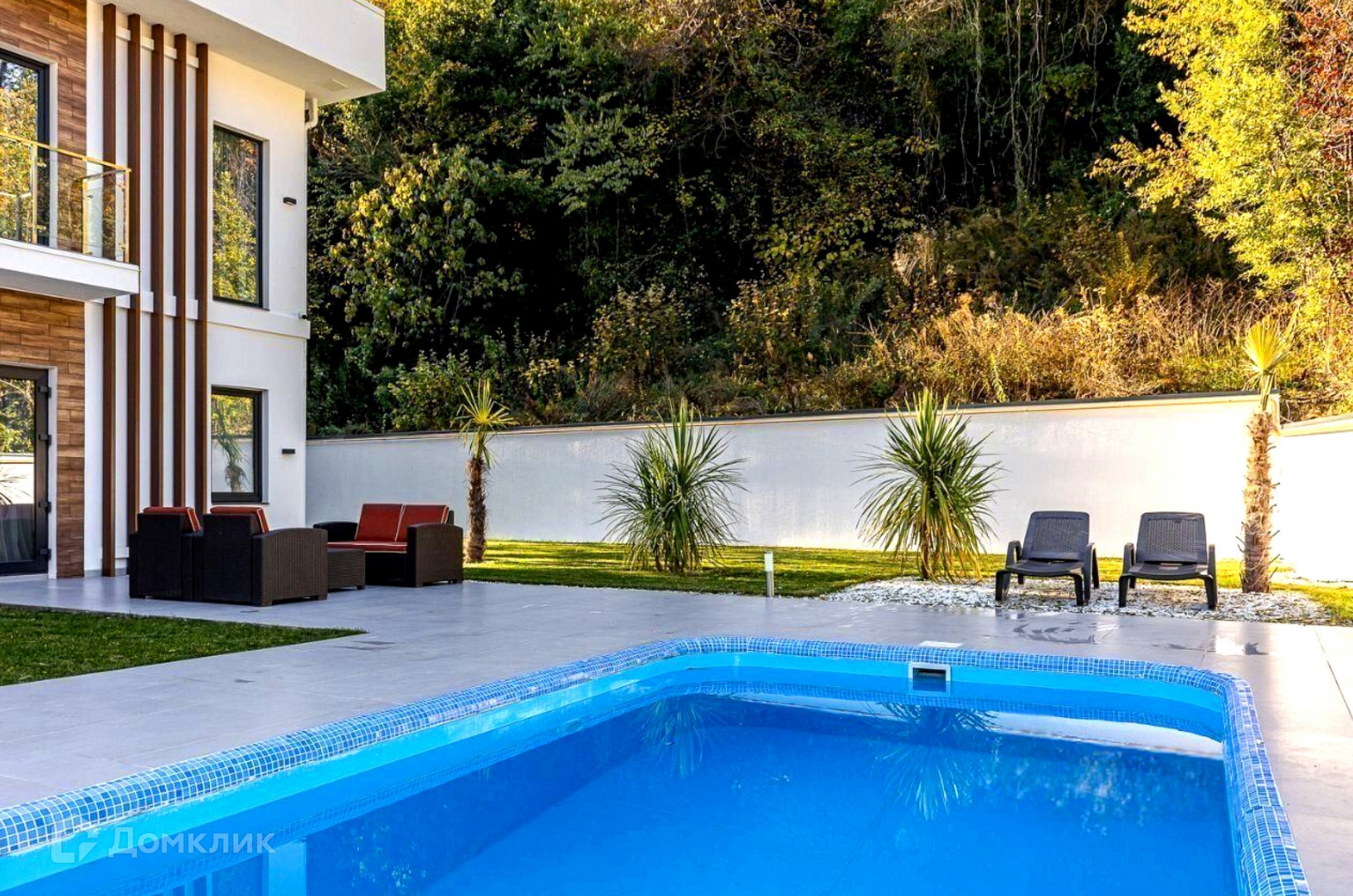 Панорамные окна, качественное ландшафтное озеленение, бассейн, гараж и стоянка на три автомобиля.