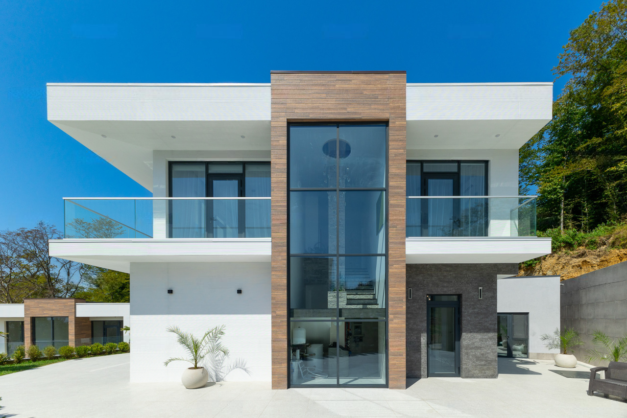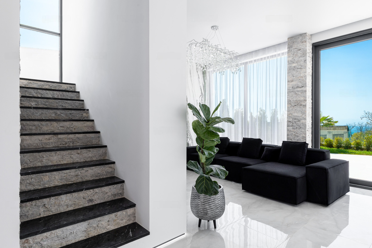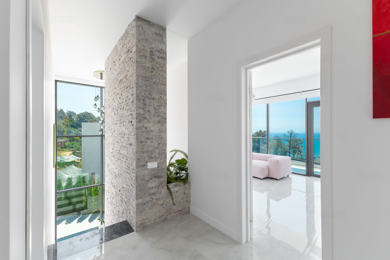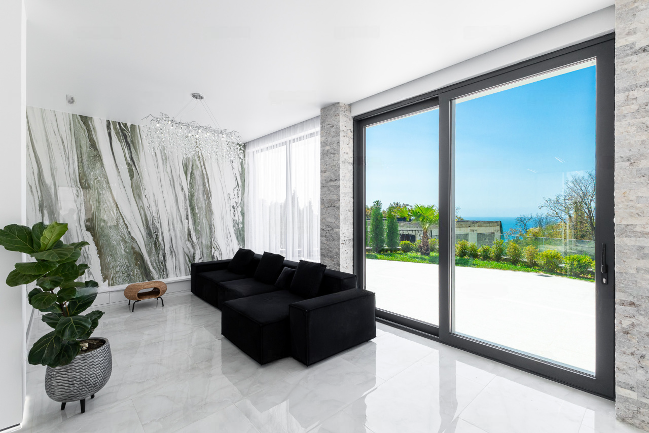Фундамент: свайное поле из 17 буронабивных свай. Облицовка фасадов здания: из натурального камня Травертин, состыкованный с вентилируемым фасадом на под системе из премиального керамогранита. Окна Алюминиевые: Alumil (Премиальная серия, Греция), автоматика Zigenia (Германия). Практически из всех окон дома открывается панорамный вид на Черноморское побережье, Олимпийский парк и образовательный центр Сириус.