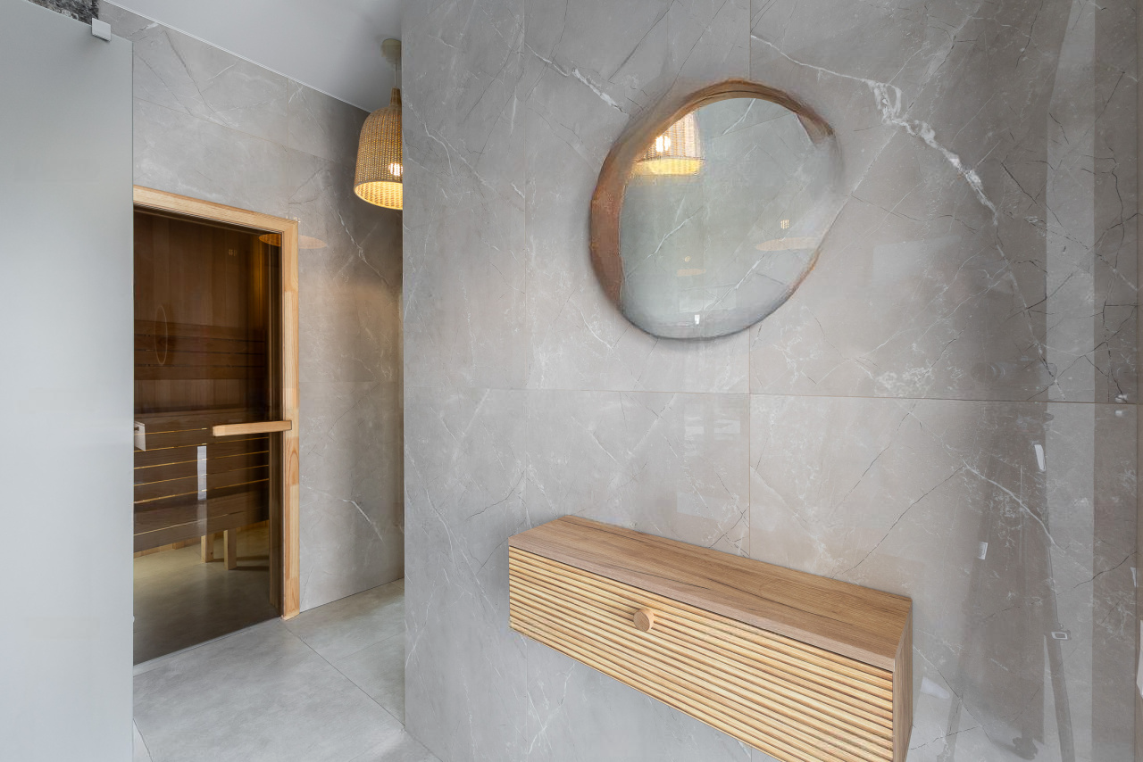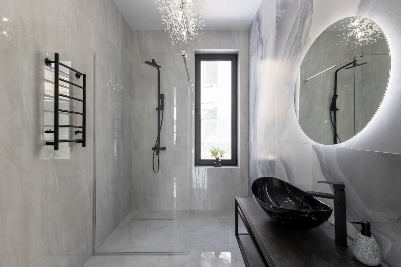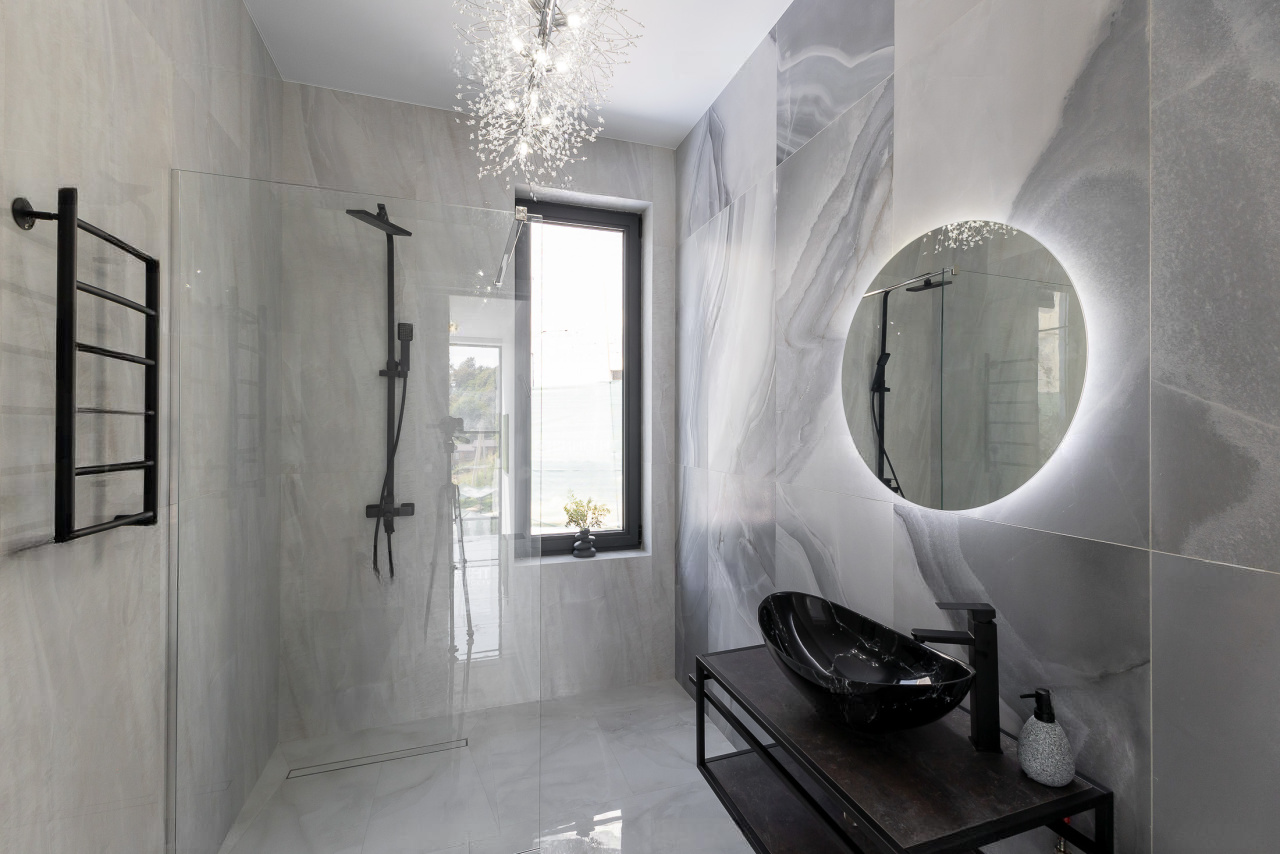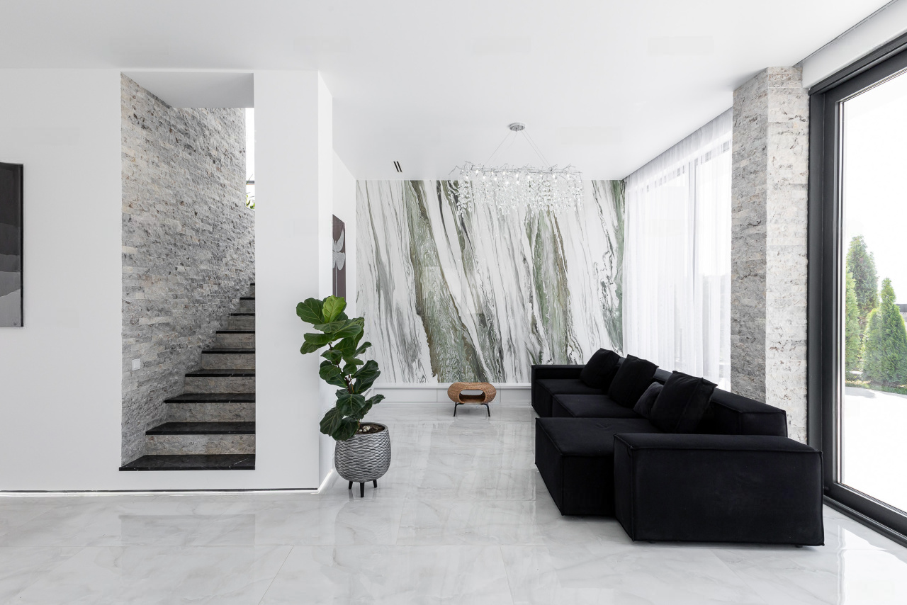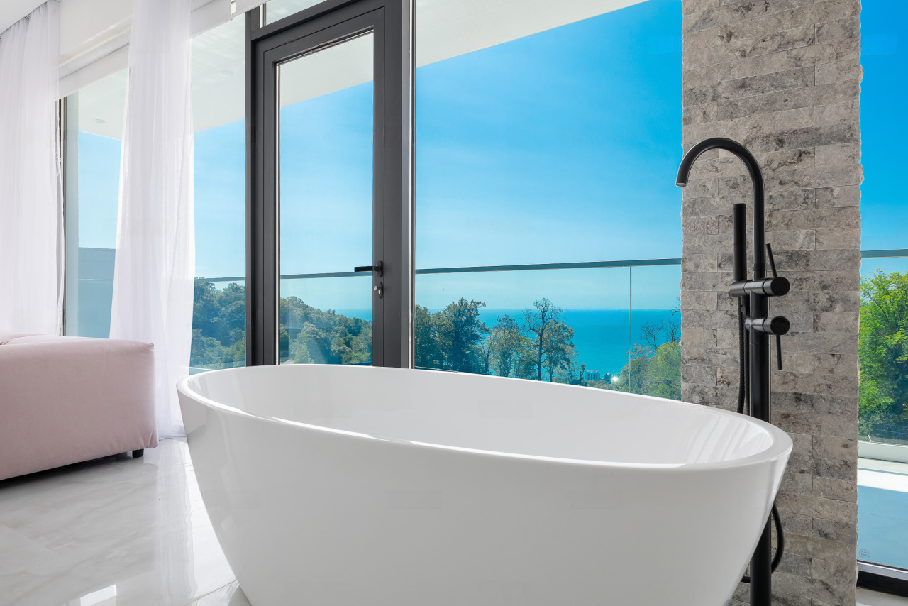 Фундамент: свайное поле из 17 буронабивных свай. Облицовка фасадов здания: из натурального камня Травертин, состыкованный с вентилируемым фасадом на под системе из премиального керамогранита. Окна Алюминиевые: Alumil (Премиальная серия, Греция), автоматика Zigenia (Германия). Практически из всех окон дома открывается панорамный вид на Черноморское побережье, Олимпийский парк и образовательный центр Сириус.