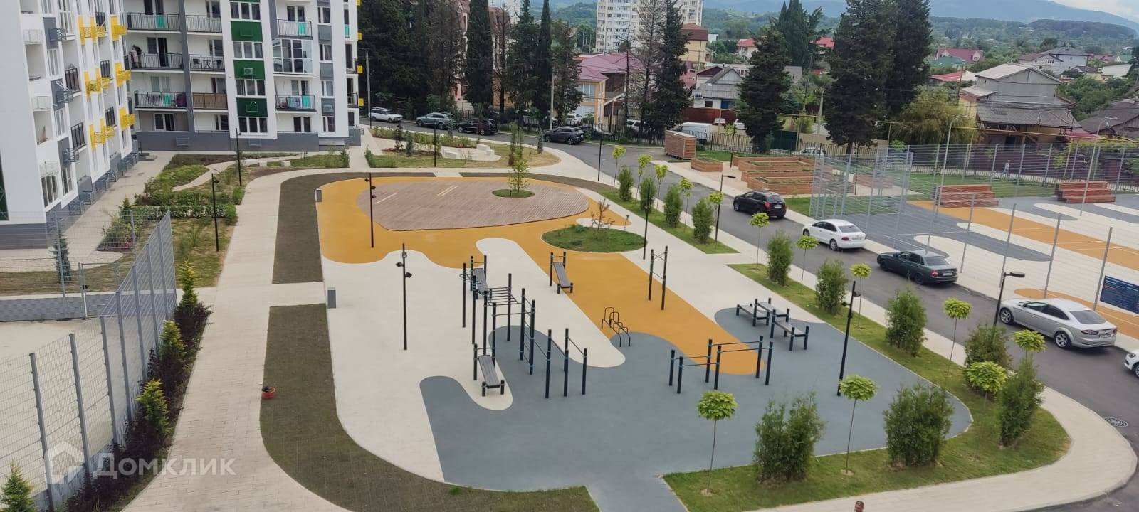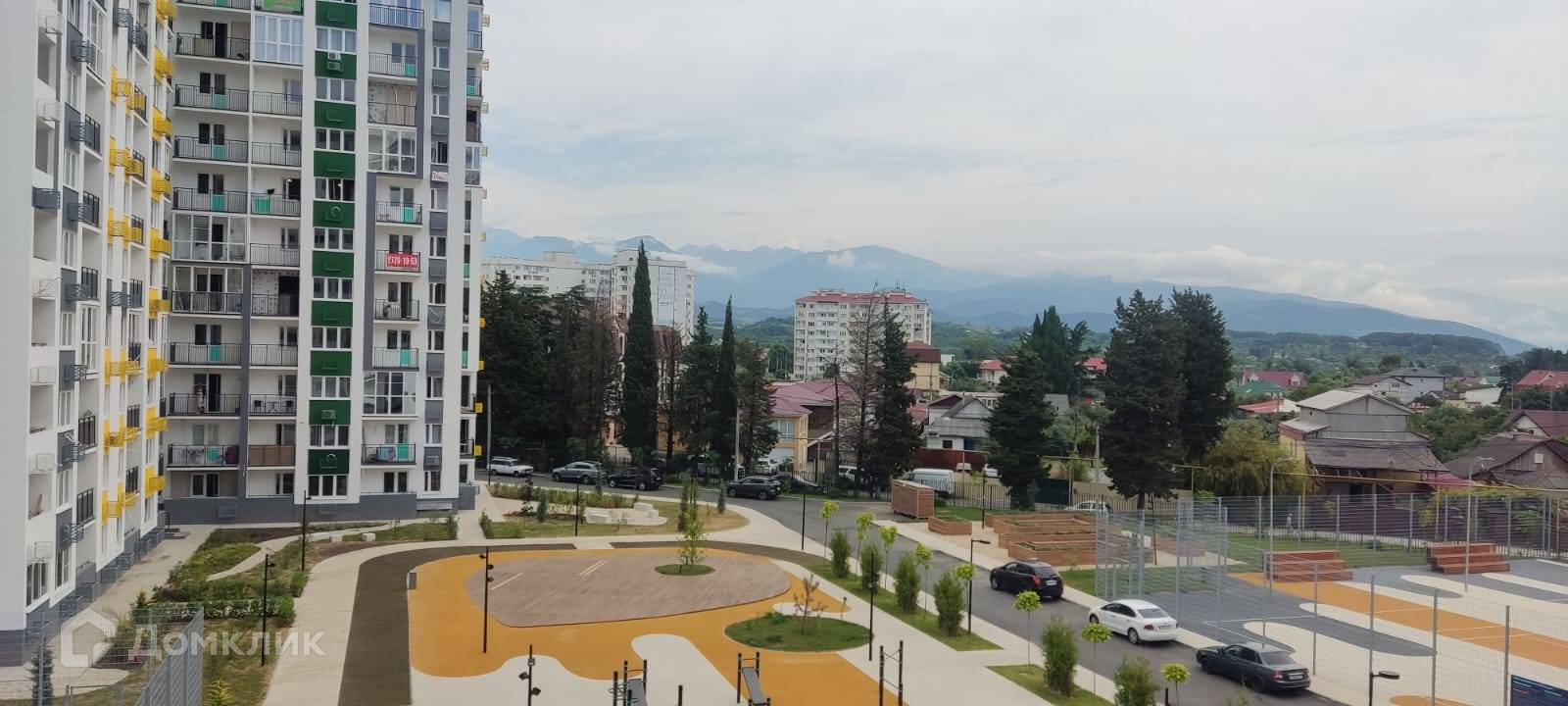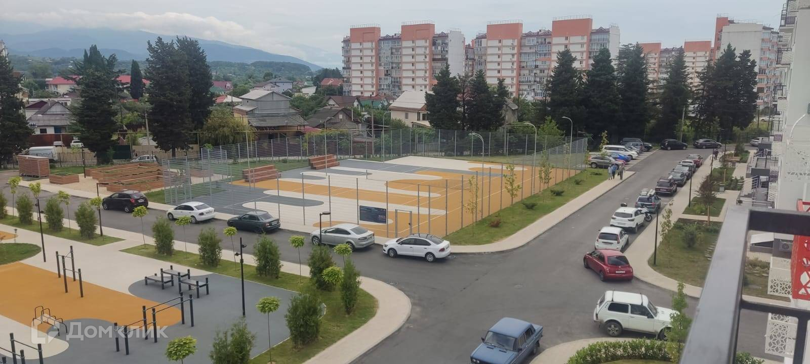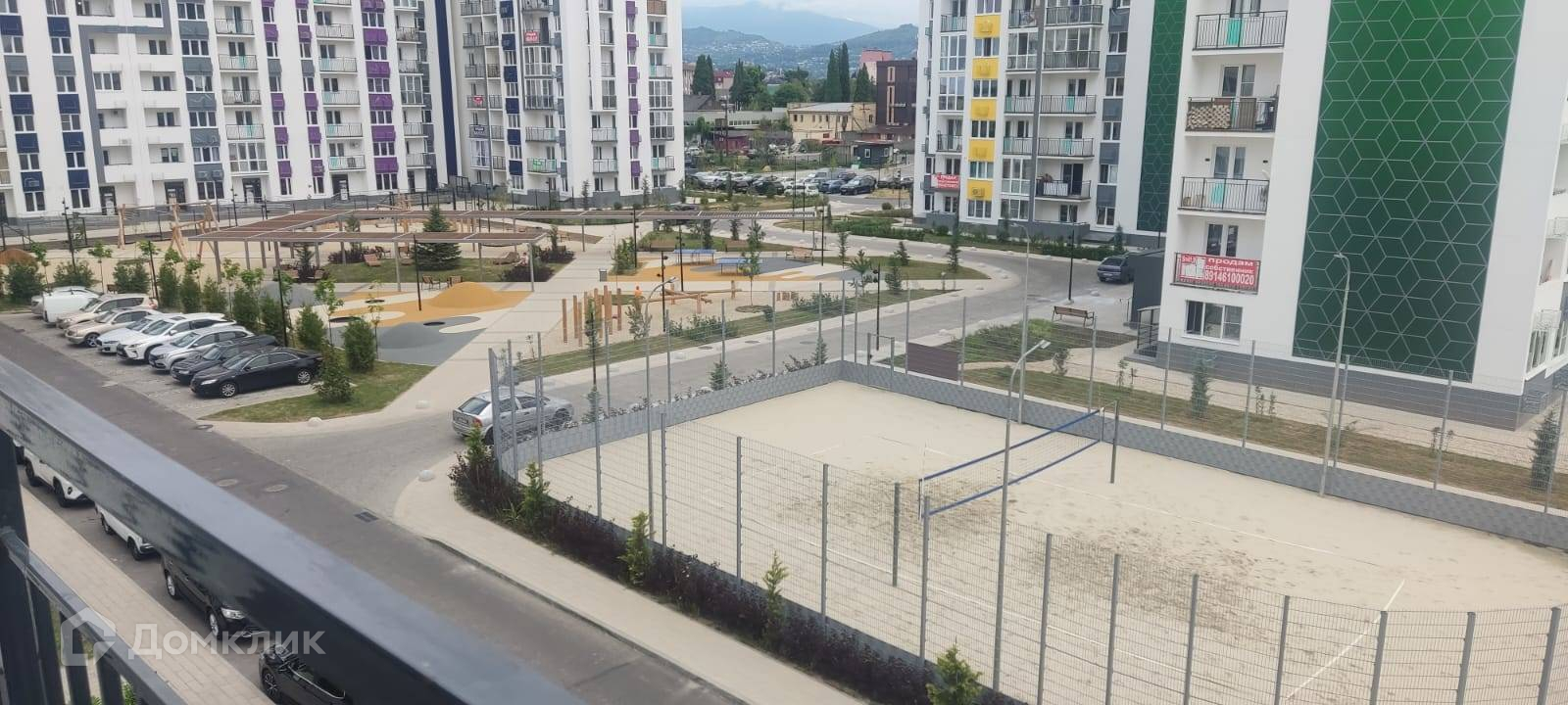 Охраняемая территория, детские и спортивные площадки, парковка, окна с видом на детскую площадку, горы и море.
