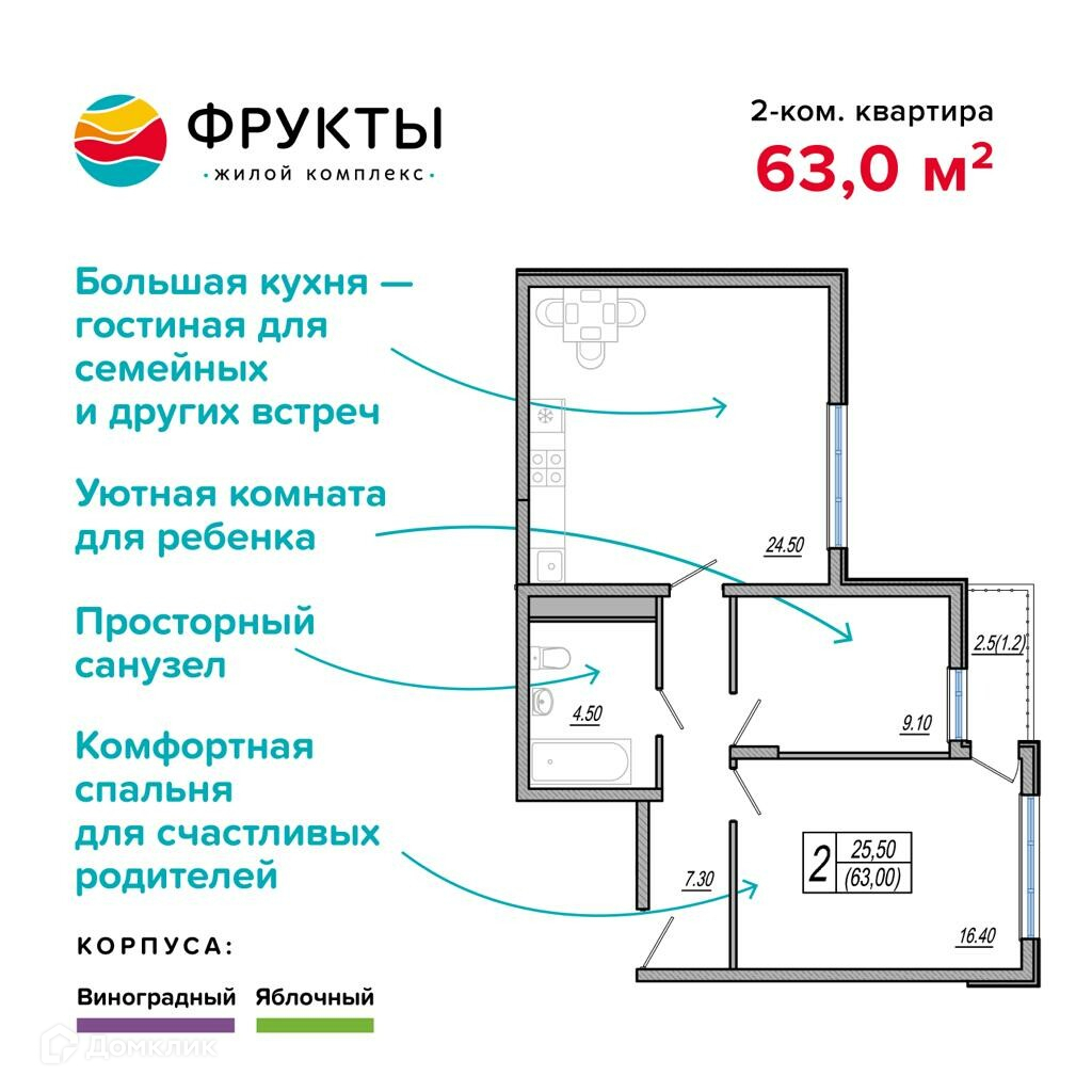 Общая площадь 63 м2